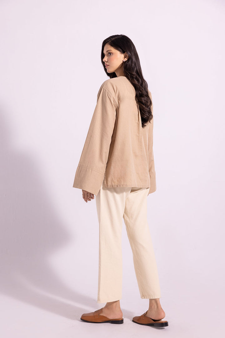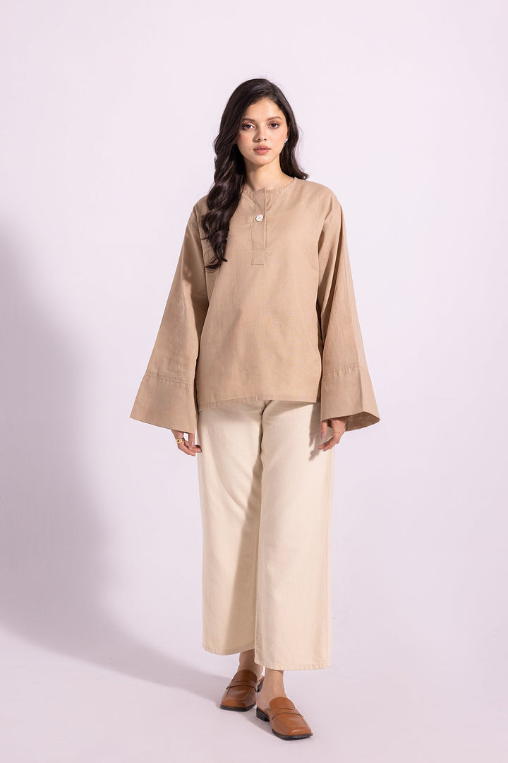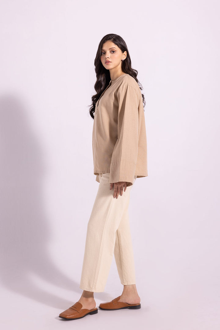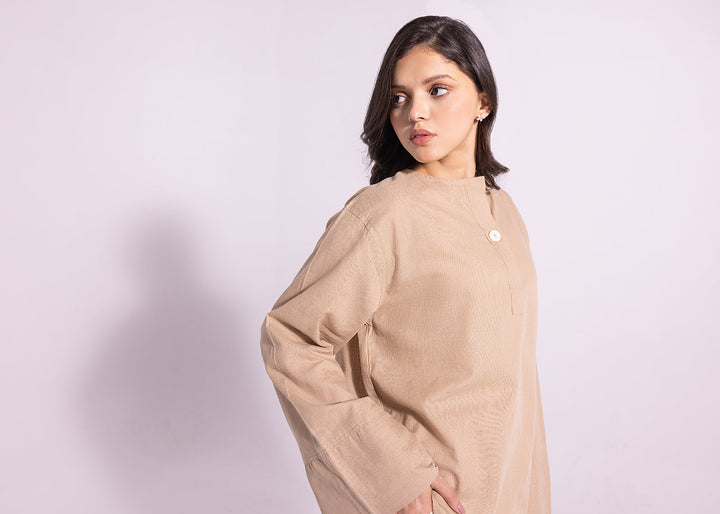A chic and trendy design is portrayed on this classy shirt rendered in a beige shade. Crafted in a contemporary silhouette with round neck illustrating a minimalistic approach, this trendy solid top is a great option for fun gatherings.