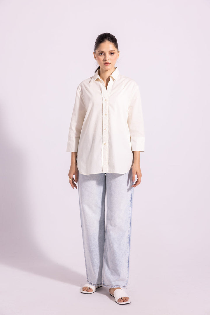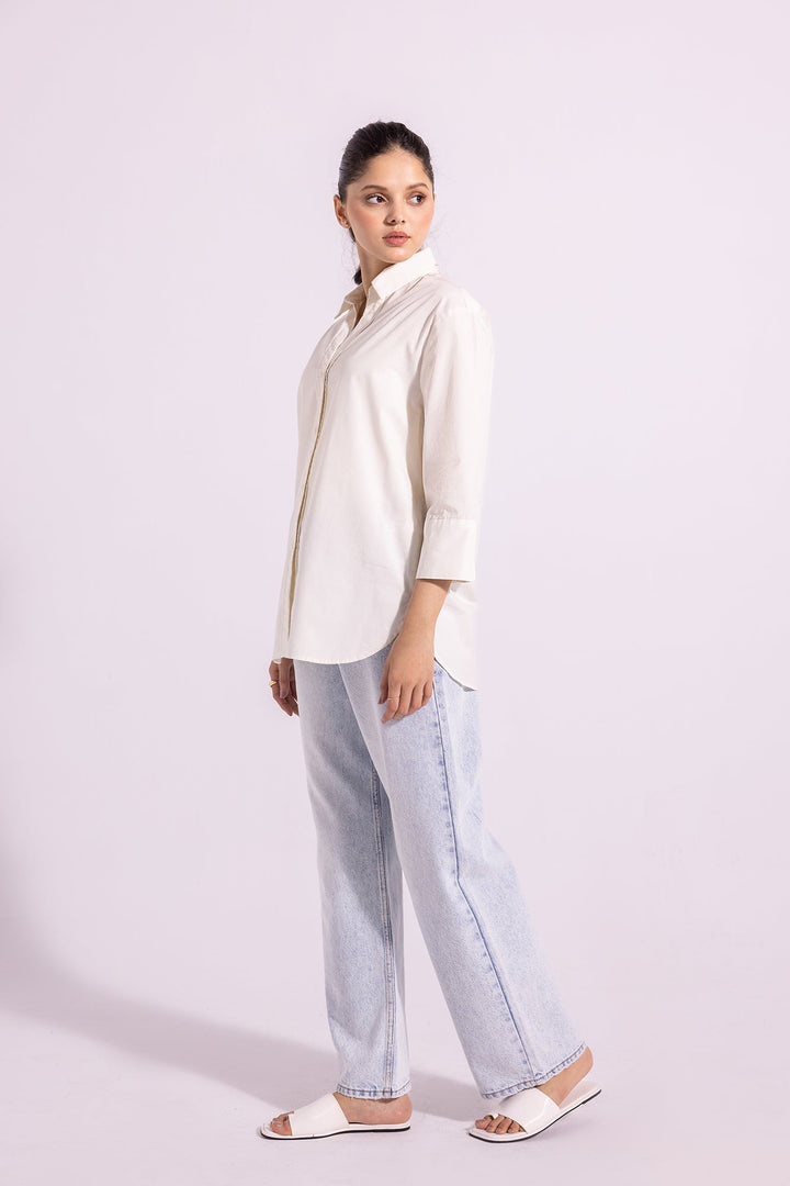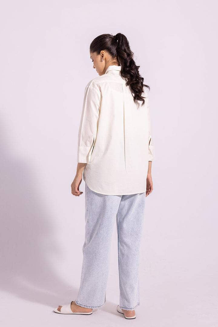 A classy yet elegant design is portrayed on this contemporary button down shirt rendered in a classy off white shade. Crafted in an resplendent silhouette with collar neck, this trendy shirt is a great option for casual gatherings.