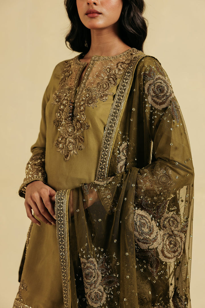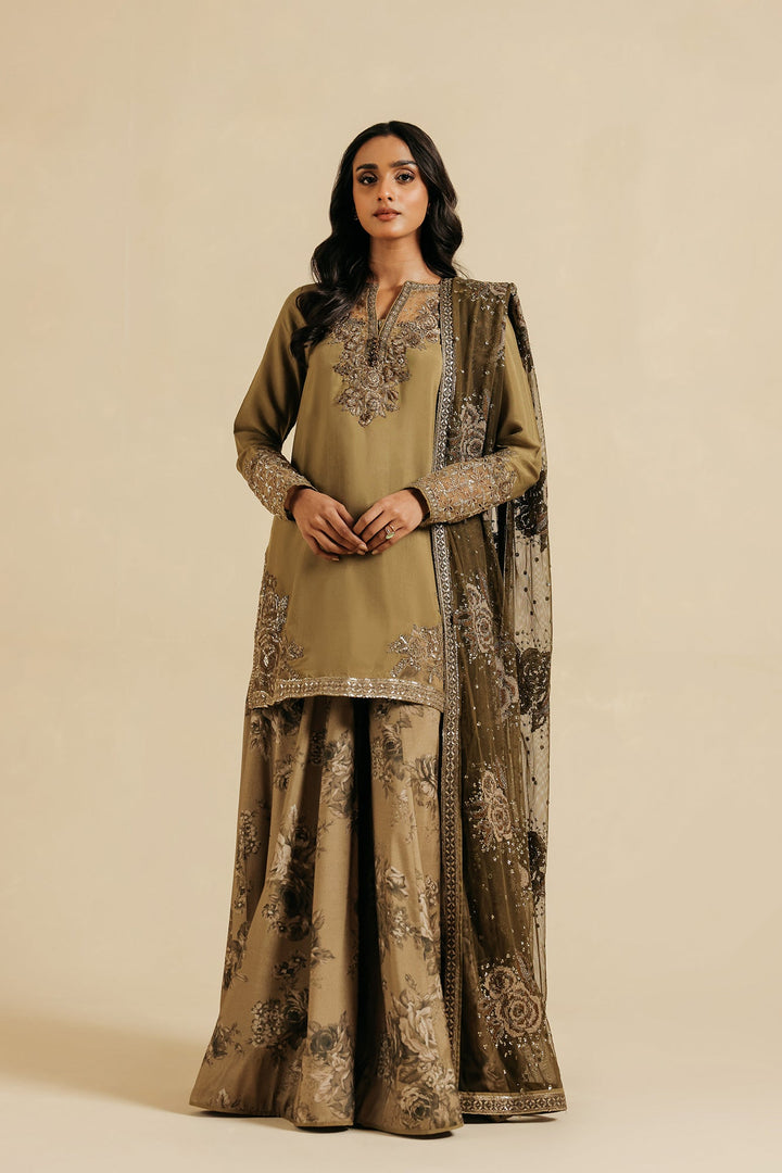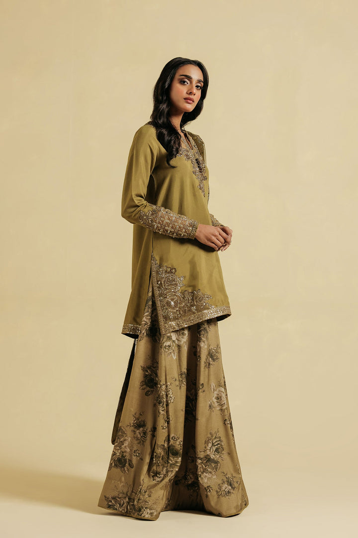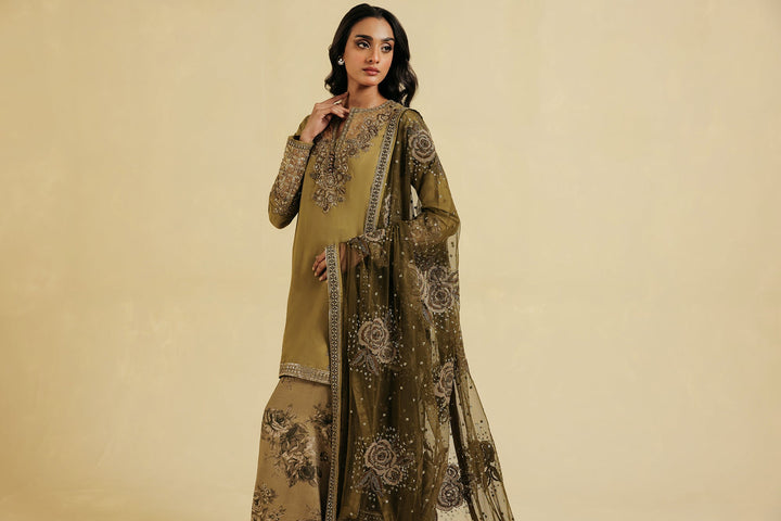 A classically rich composition is layered over this graceful ensemble rendered in an appealing chocolate shade. It features a mesmerizing shirt adorned with captivating embroidery with scintillating details. Paired with an elegantly flowing sharara with beautiful floral prints, the style statement look is completed with a gracefully embroidered dupatta. Embrace this alluring outfit at festive events this season.