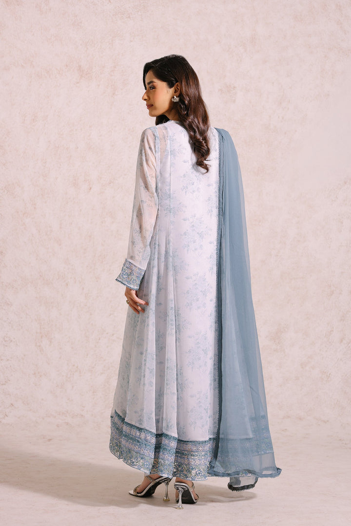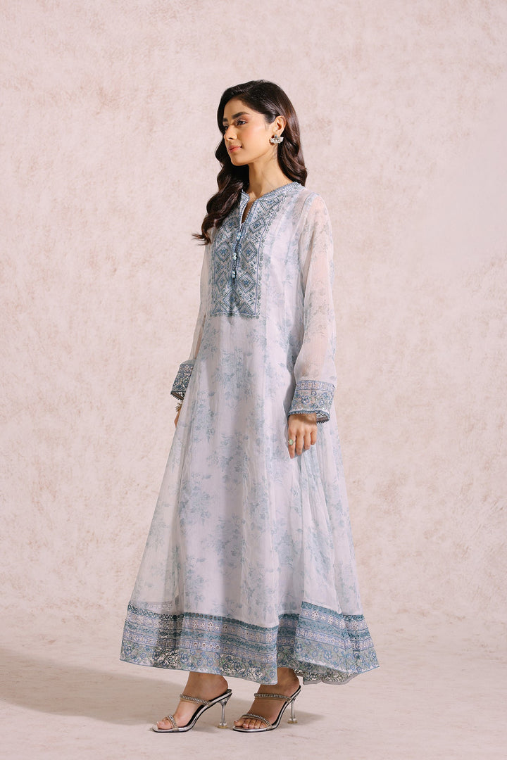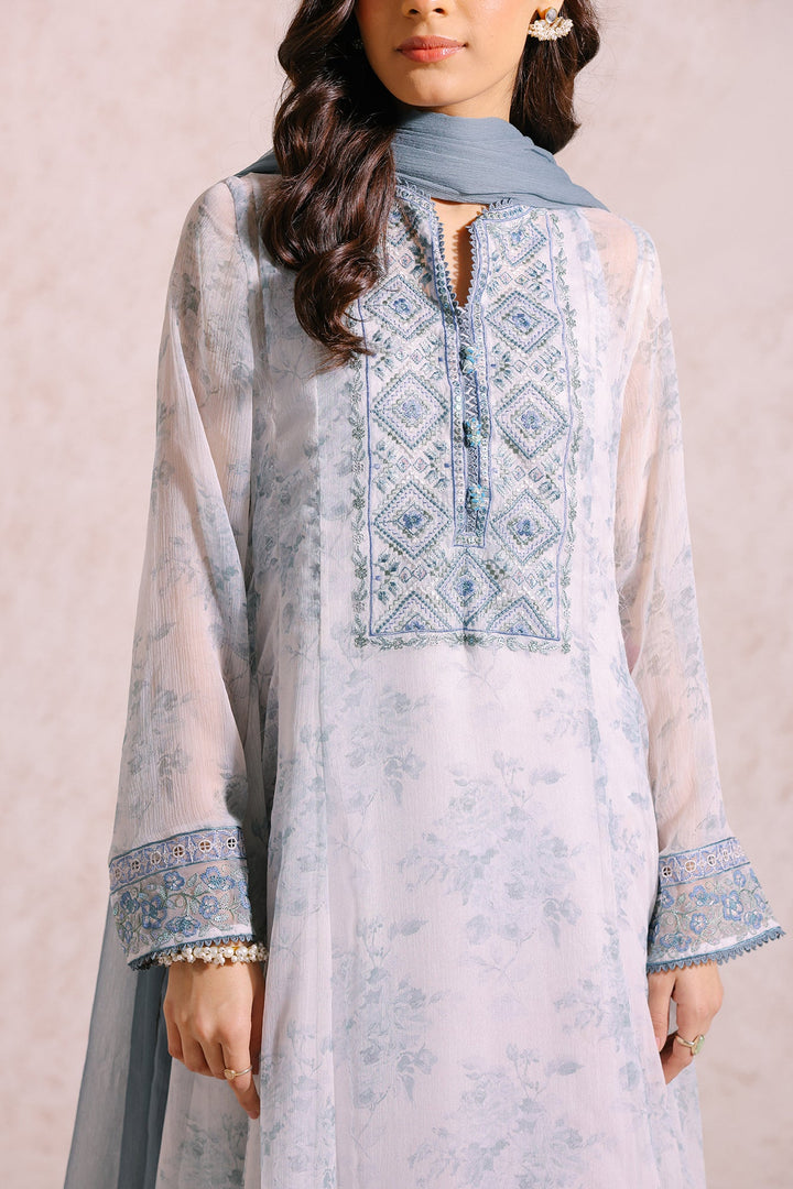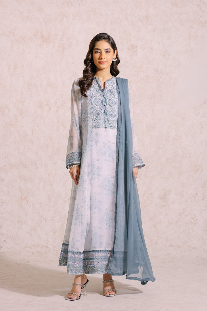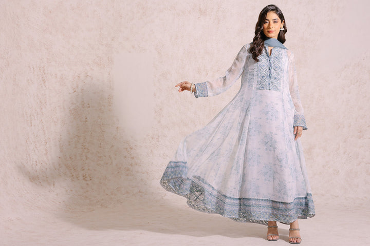 Style like a diva this festive season in this refreshing ensemble illustrated in light grey shade. Crafted in a classy pishwas silhouette with panels and adorned with beautiful floral prints, the elegant shirt is enriched with intricate embroidery at front, sleeves and bottom opening with captivating floral designs. Paired with a solid inner slip and a gracefully draped deep hued dupatta, embrace the gorgeous look at formal events in this statement outfit.