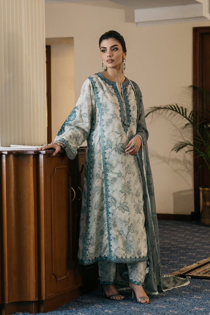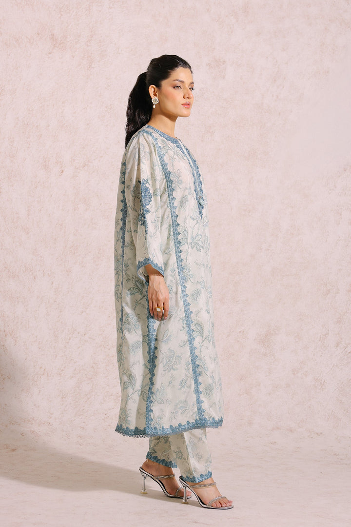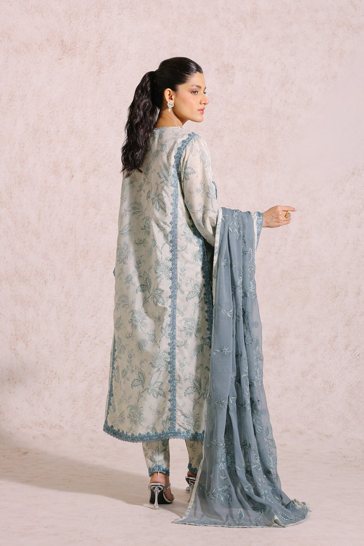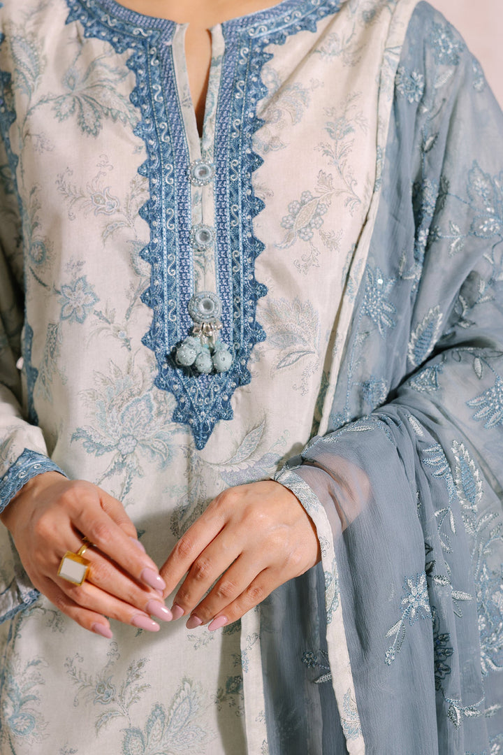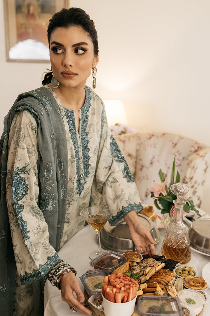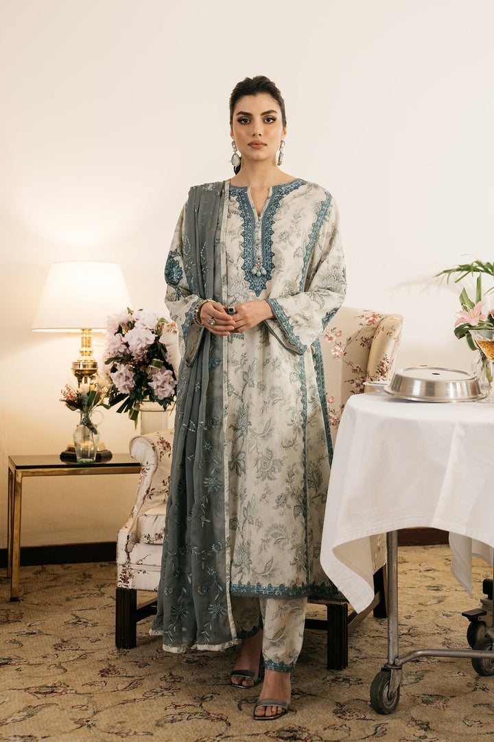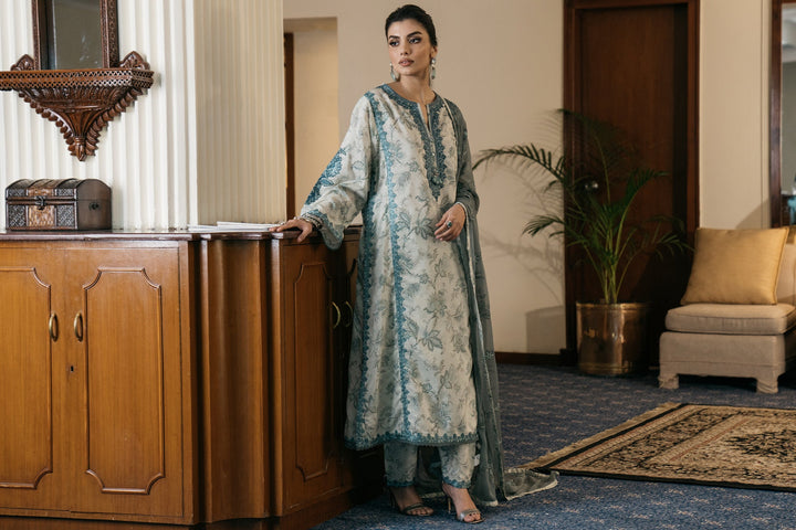 An aesthetically appealing composition is portrayed on this classy ensemble rendered in a subtle vanilla ice shade. It features an elongated shirt adorned with beautiful floral prints in refreshing hues and enriched with intricate embroidery with captivating designs. The aesthetically rich shirt is paired with a contemporary shalwar with embroidery at bottom opening and a gracefully draped embroidered dupatta illustrated in contrasted deep hues, this alluring outfit is a great option for formal occasions this season.