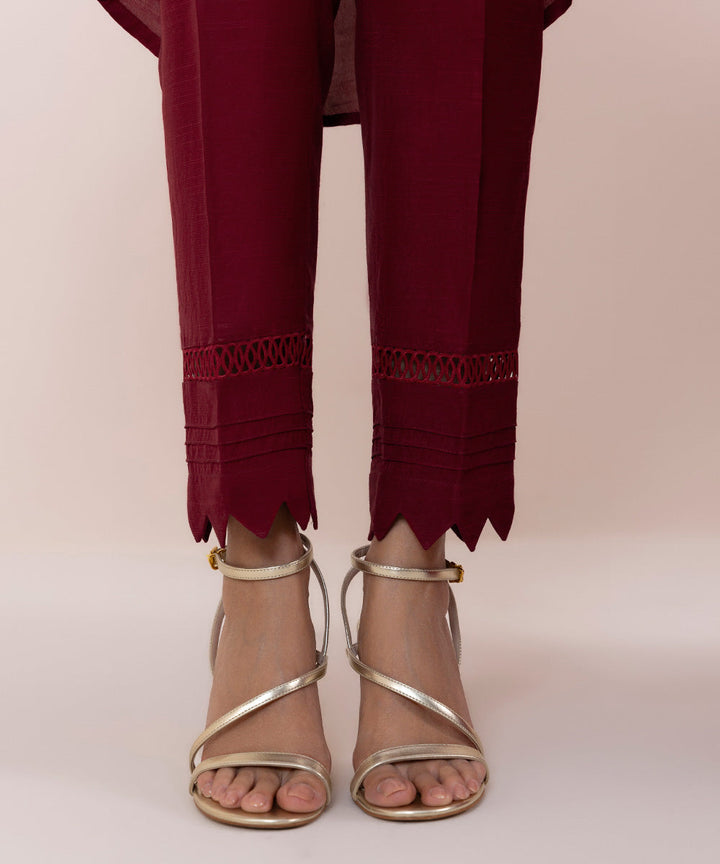 Elevate your style with our deep red flared A-line paired with cigarette pants and an embroidered dupatta.