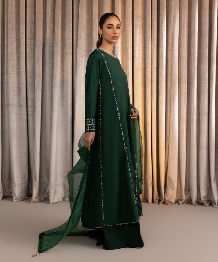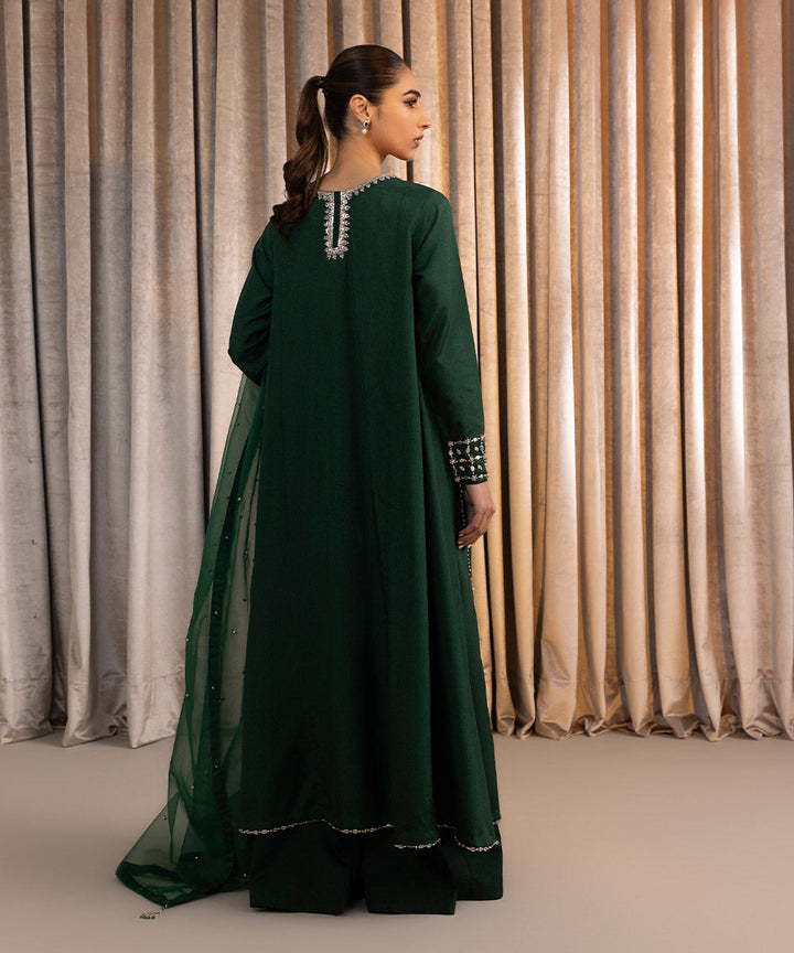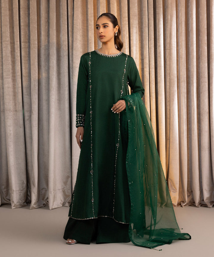 Revel in our exquisite hand embellished silk A-line pishwas paired with a dyed sharara & a tassel detailed dupatta imbued on a dark green canvas for a timeless allure.