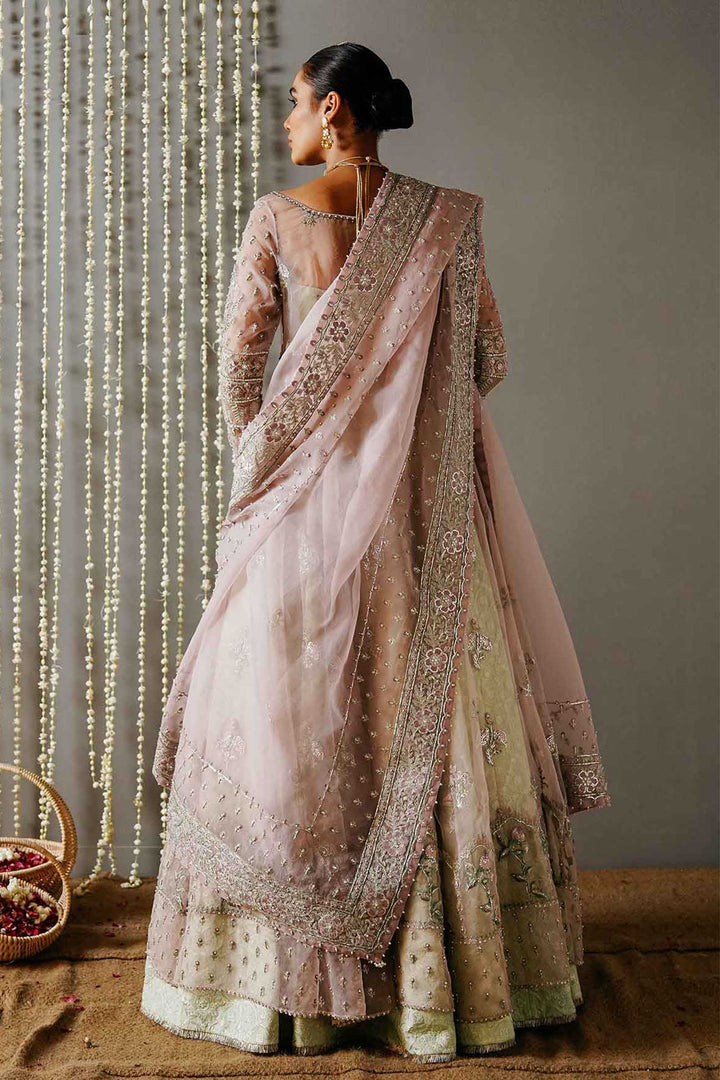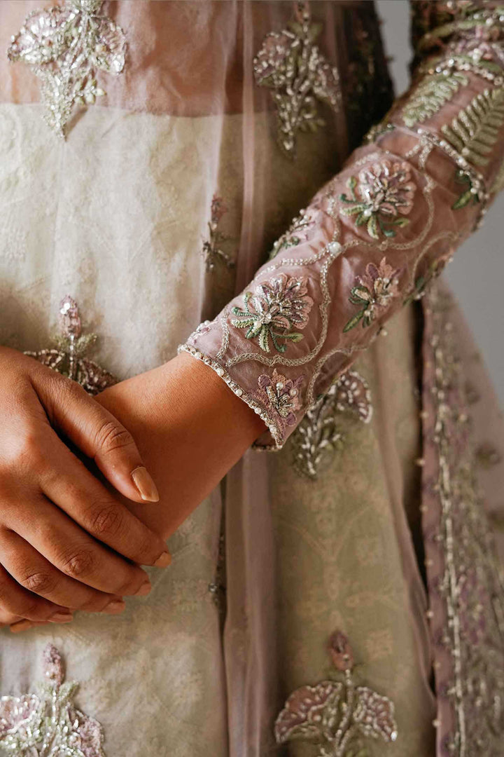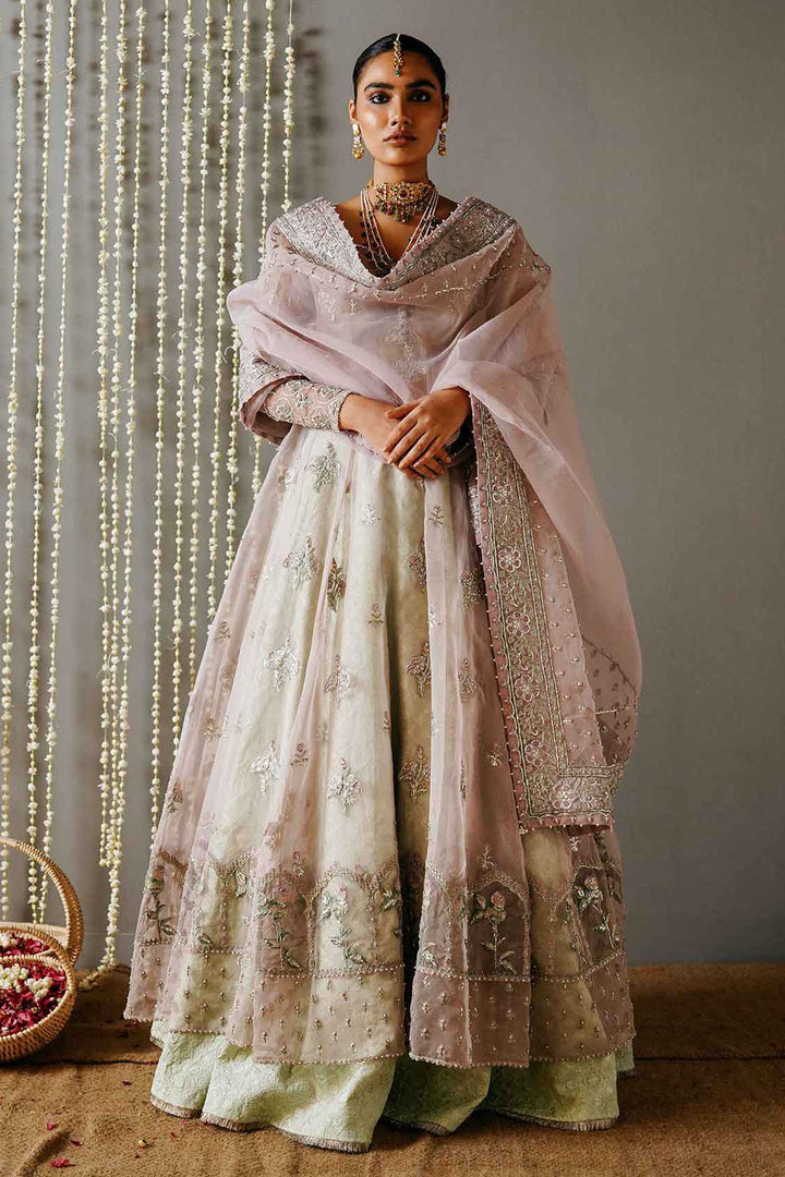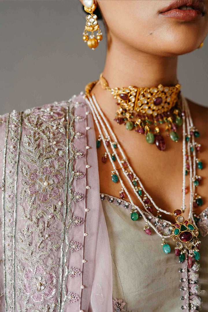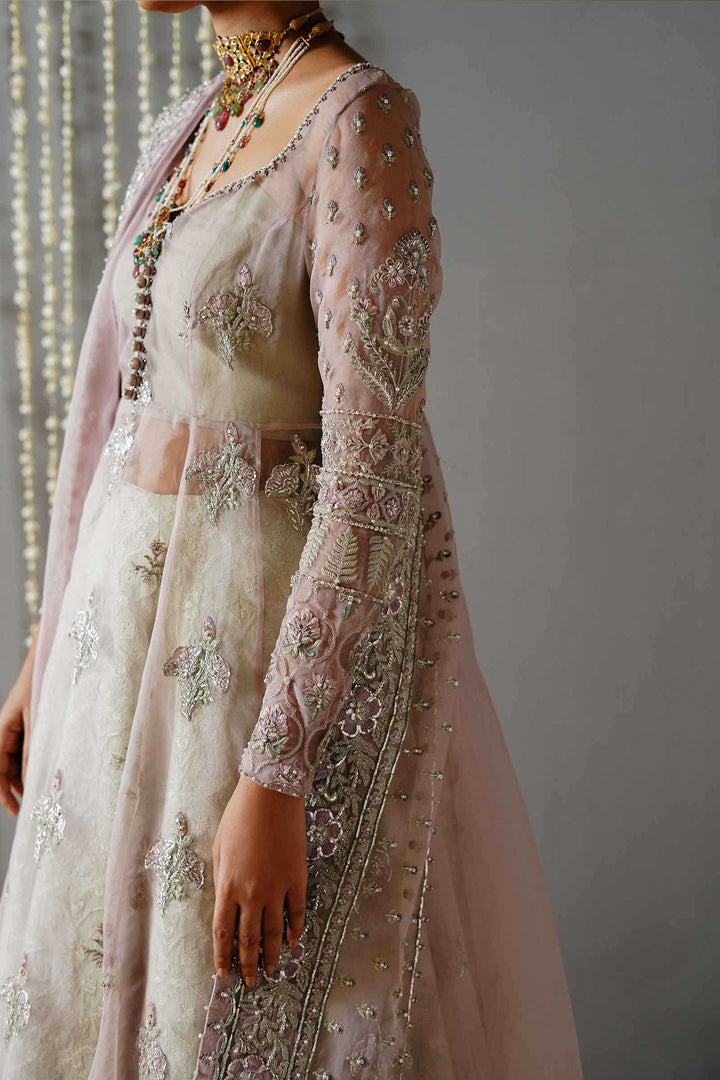 A fully embellished lilac peshwaz with floral motives and a heavy border at the hem, enhanced with intricate pitta work and adorned with pearls and crystals. It is paired with a fully embroidered pale green lenhga and a lilac organza dupatta with heavily embellished borders along all four sides, finished with pearl trims.