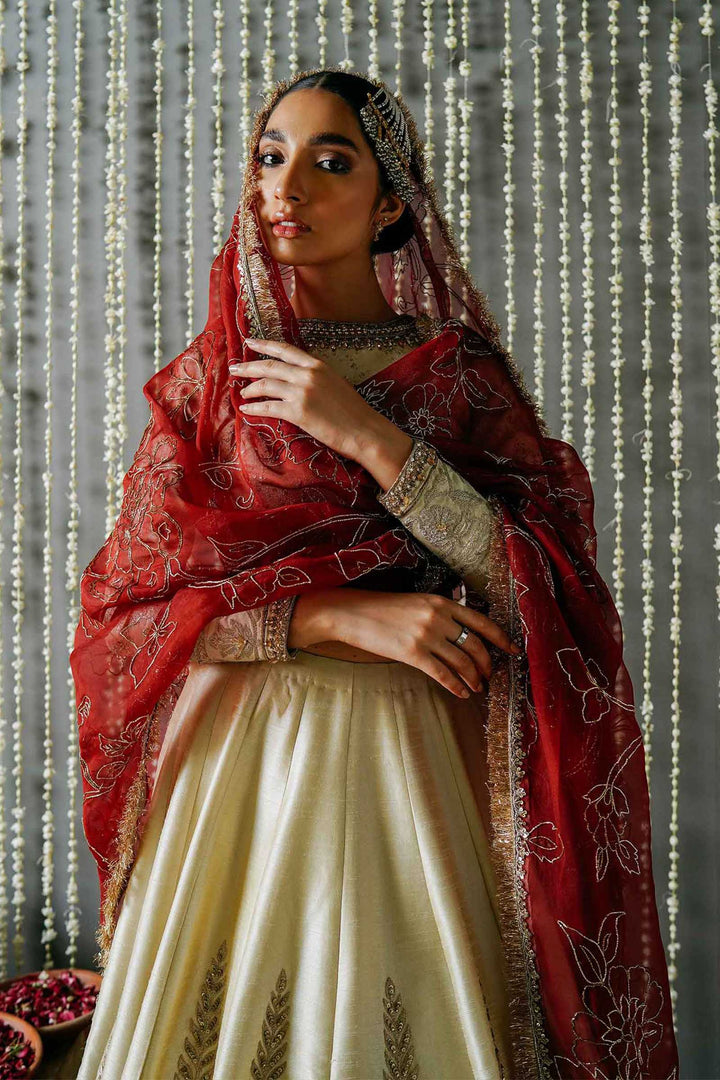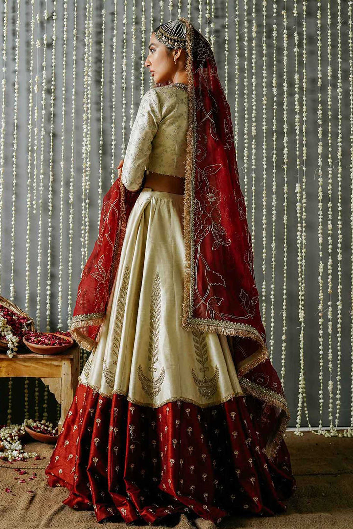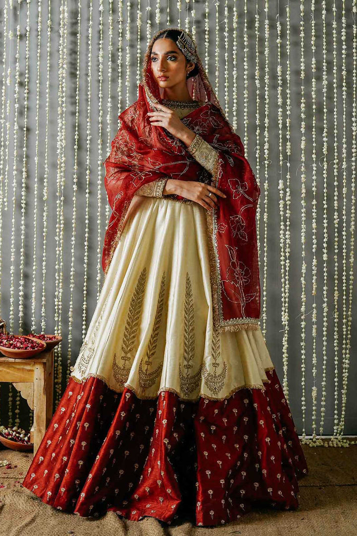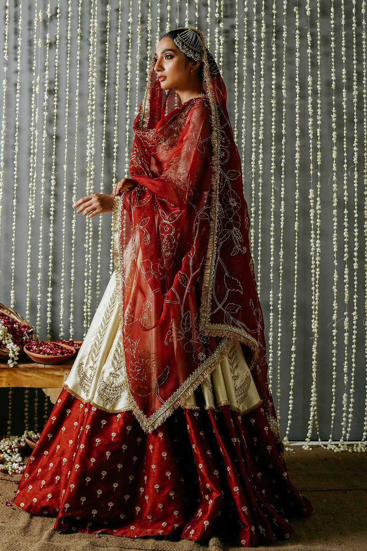 A fully embellished color blocked lehnga with gotta work and hazar boti on the bottom and elaborate motives towards the top. It is paired with a richly embroidered sequence jaal choli, embellished with a jeweled neckline and border on the sleeves. The look is completed with a deep red dupatta with our staple floral jaal made in naqshi and intricate sequence boarder.