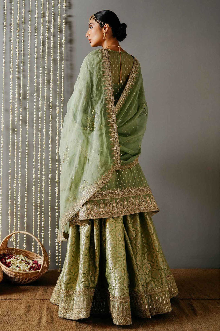 A classic old school kamkhaab gharara with a richly embellished border. It is paired with a loose fit five paneled fully embroidered kurta with churidar sleeves. It is embellished with a spray of sequence and hand embellished bail along the panel lines, an elaborate border at the hem and motif on the chest. The ensemble has a floral mukesh dupatta with an embellished border along all four sides finished with kiran.
