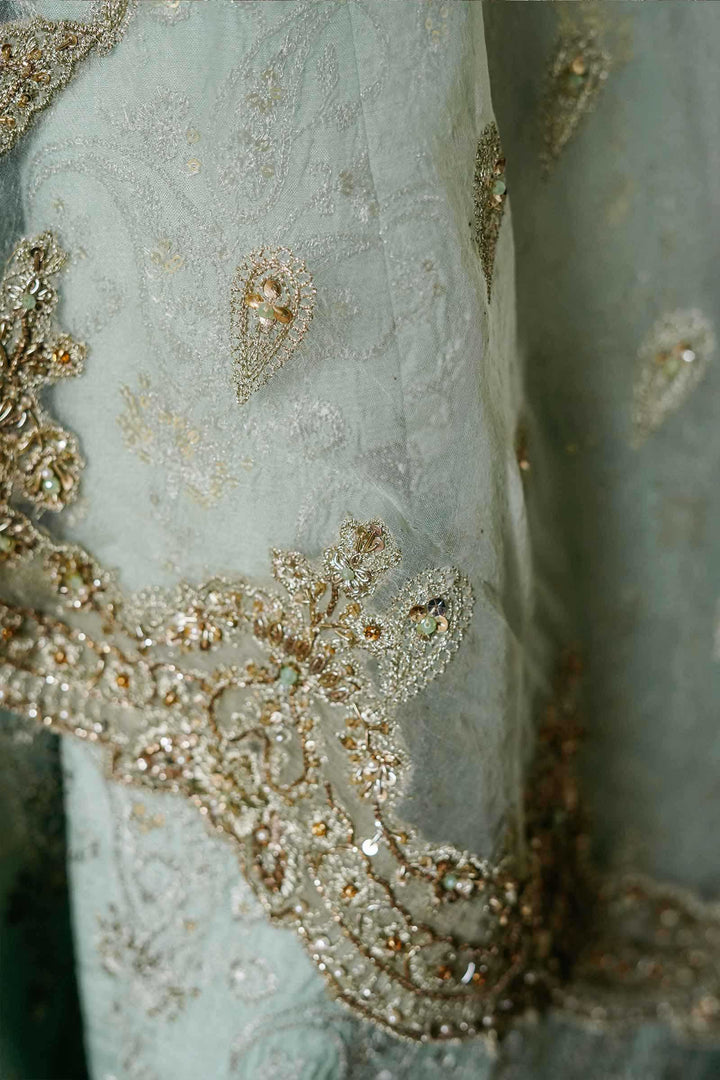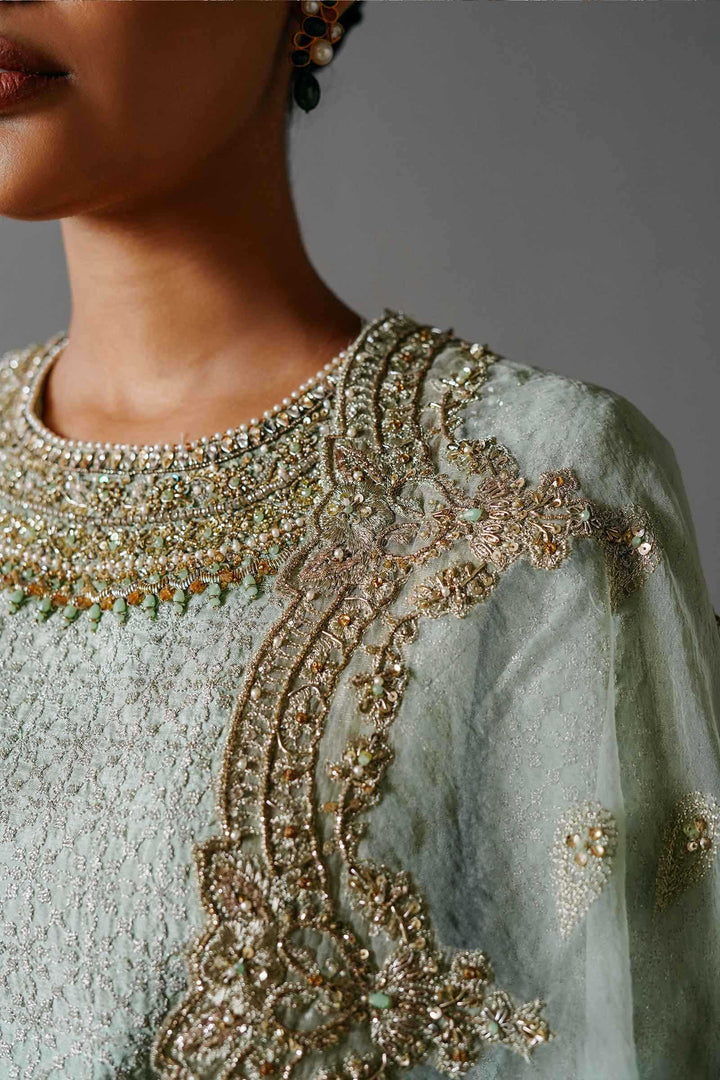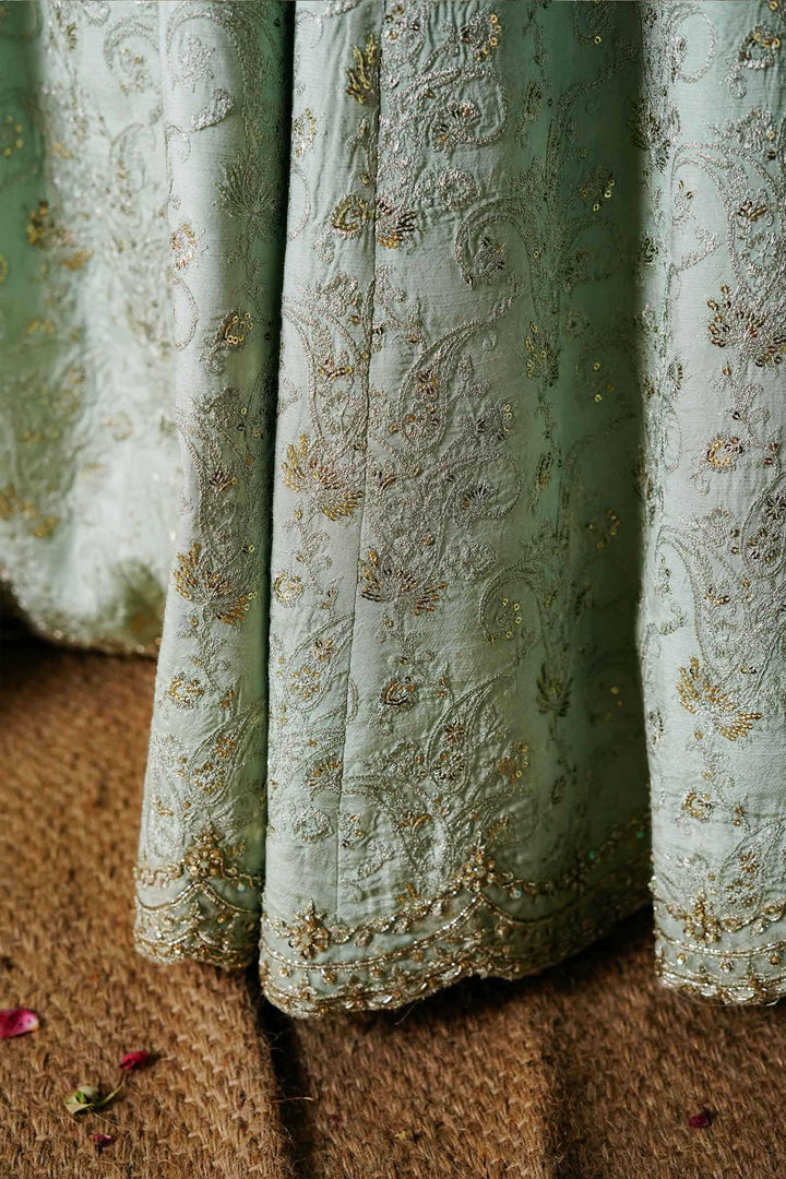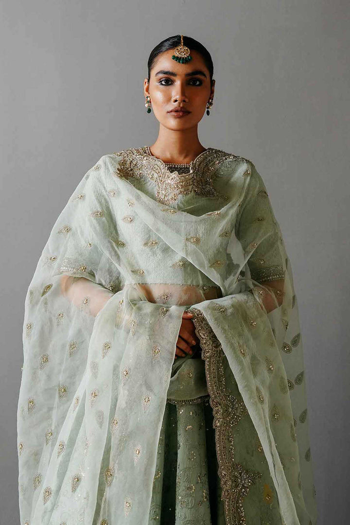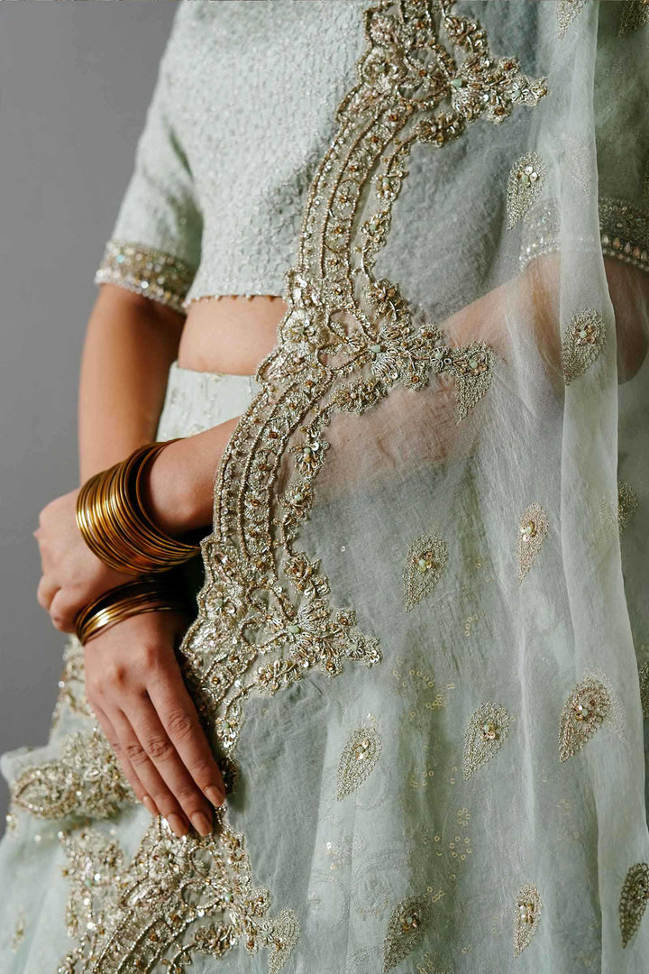 A fully embellished pale green lehnga choli with an elaborately crafted jeweled neckline and sleeve borders and an embellished scalloped border at the hem of the lehnga. It is paired with a fully embellished dupatta with intricate naqshi work adorned with pearls and crystals.