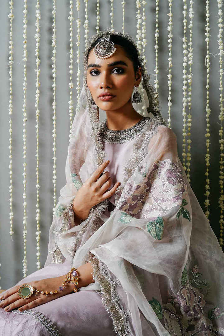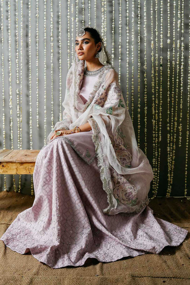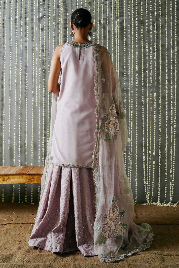 A lilac sleeveless halter shirt with a heavily embellished jeweled neckline and gotta work at the hemline and along the side seams. Intricately embellished chaand baali motives at the corners are also a part of this ensemble further paired with a densely patterned embellished lehnga. The look is completed with a tie-dyed dupatta with cross stitch embroidered floral bunches enhanced with pitta work and intricate pearls, scalloped borders and kiran finishes.