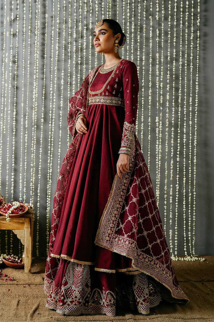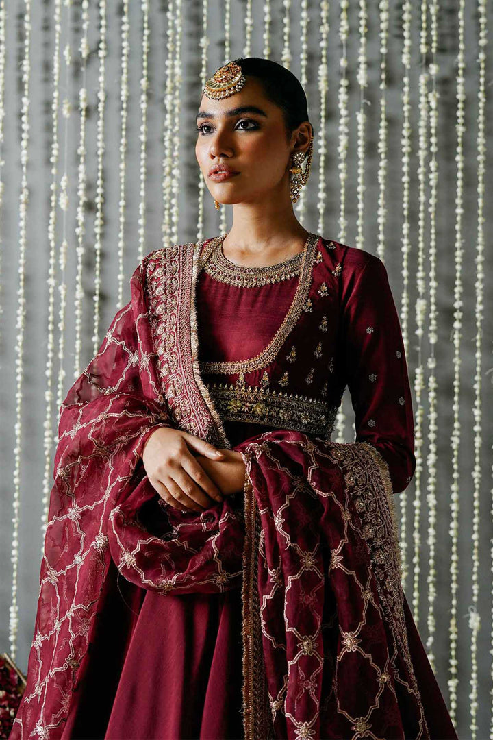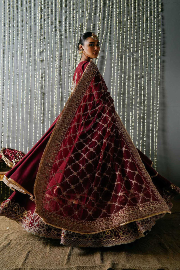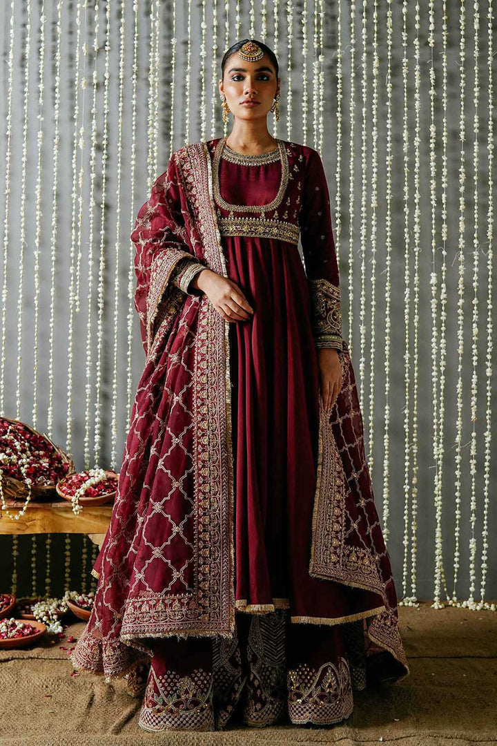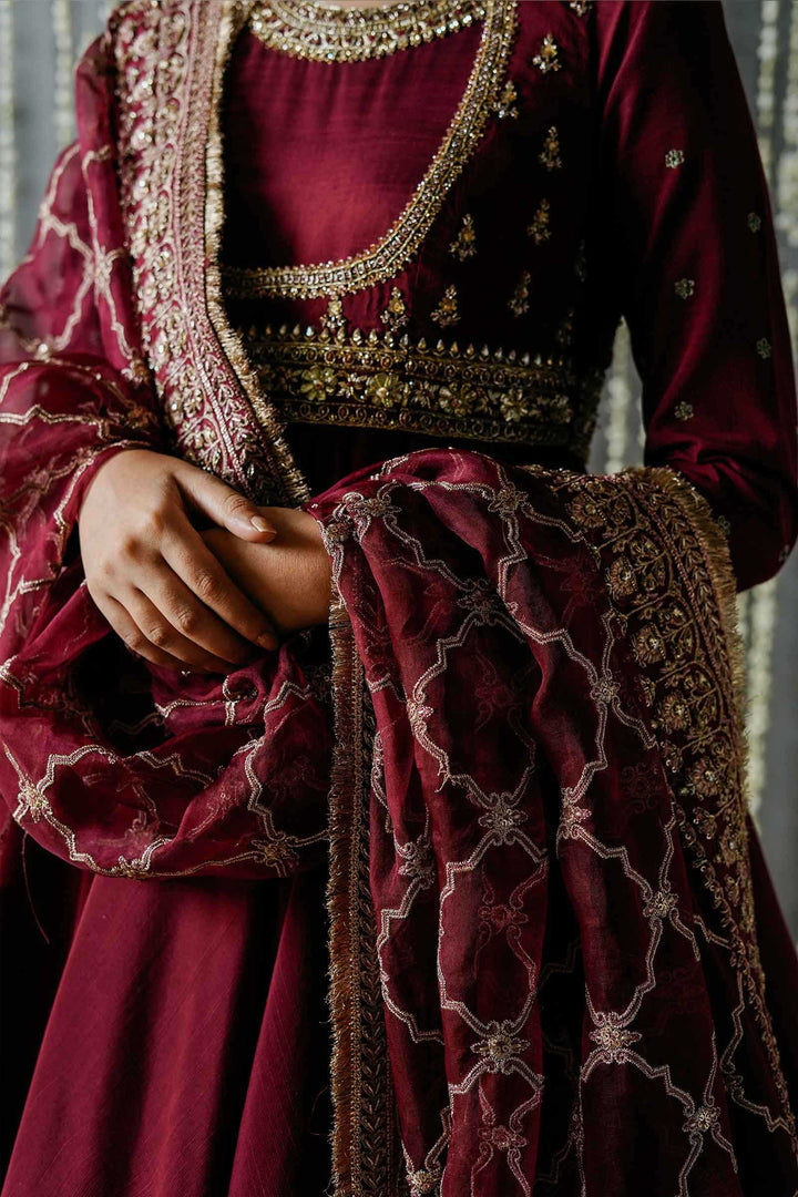 A classic magenta anarkali with embellished sleeves and intricate jeweled neckline. It is layered with a handmade coatie embellished in naqshi, sequence, resham, batkhi, gotta, marori and delicate moti. The ensemble is completed with a lehnga with an extensively embroidered border and an intricately embellished jaal dupatta with borders along all four sides.