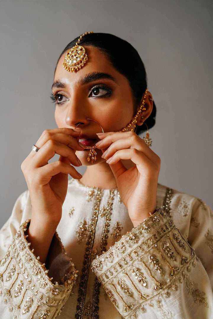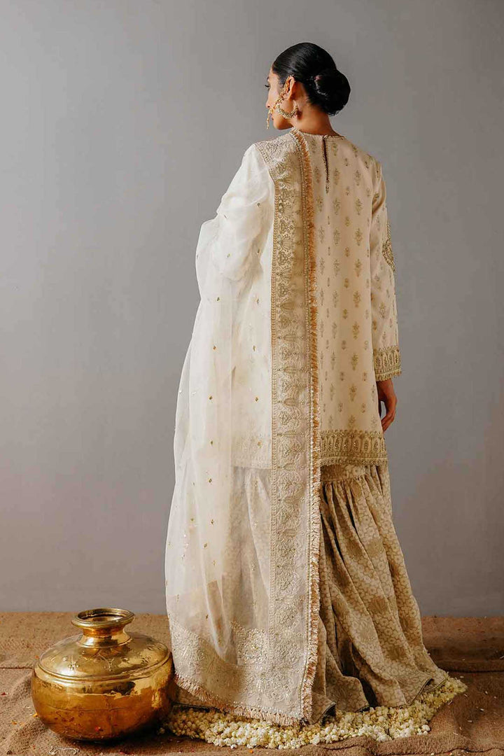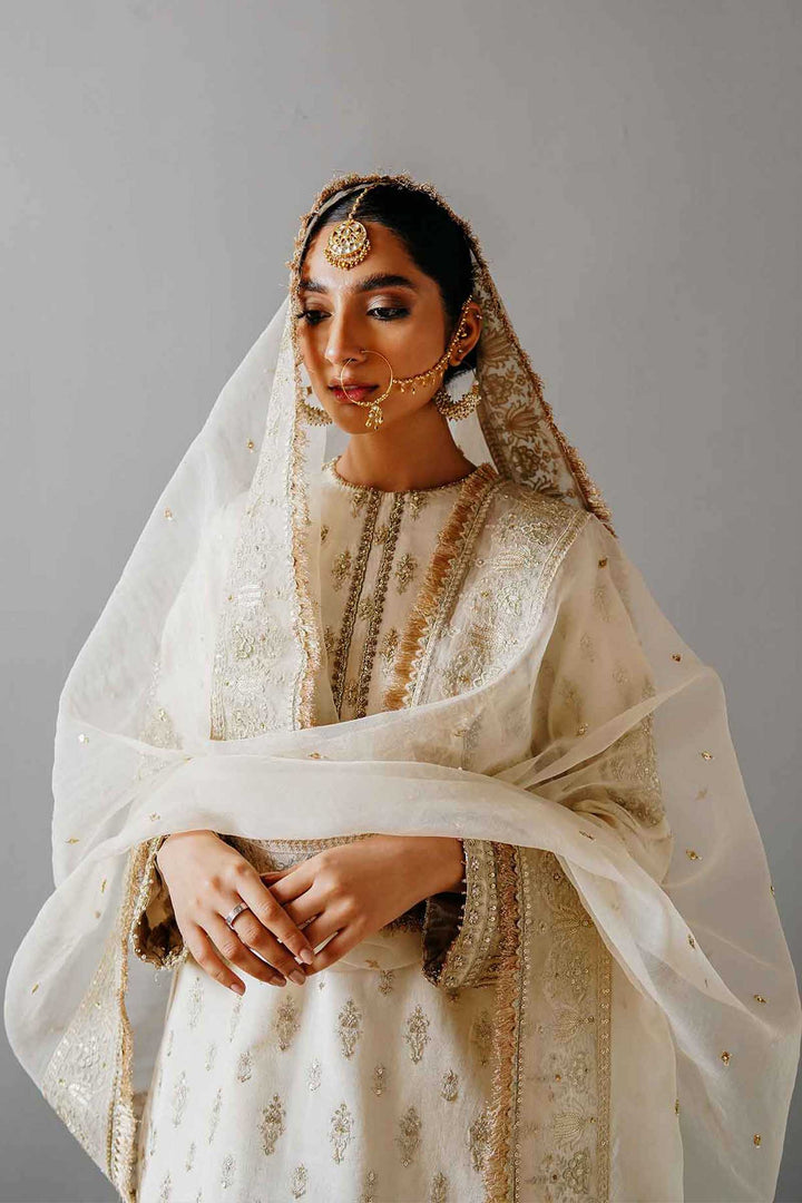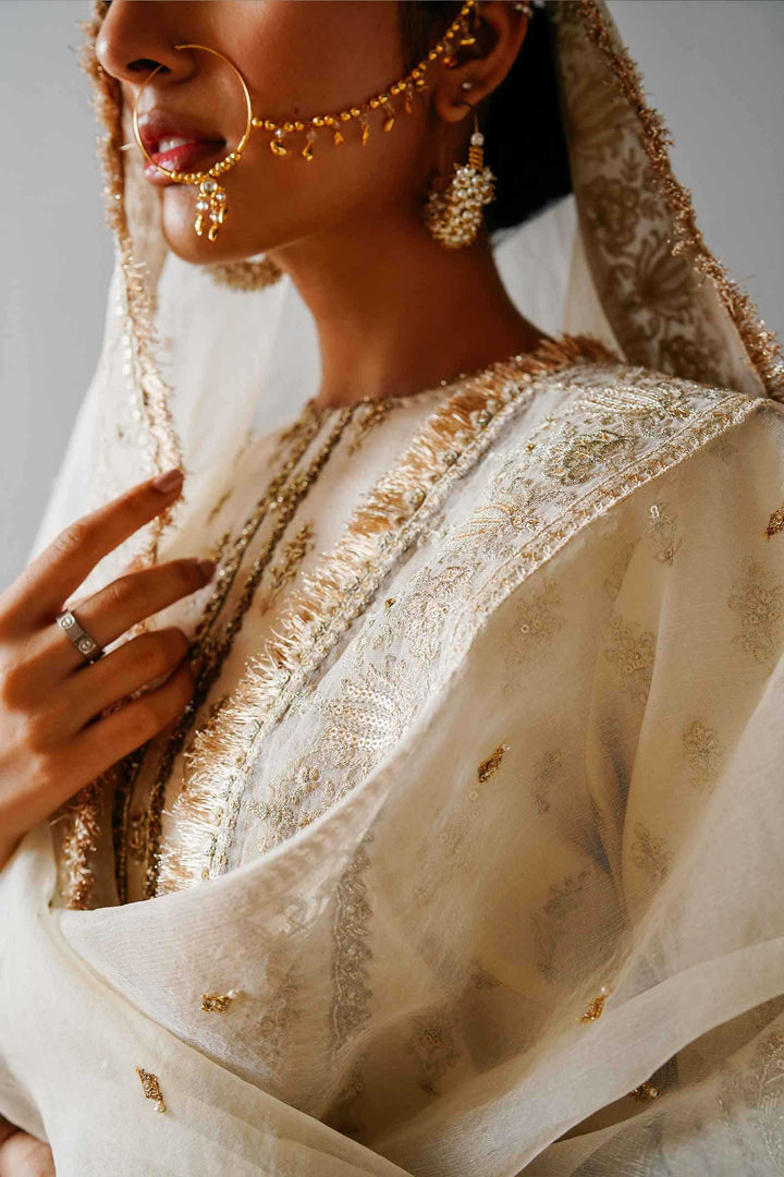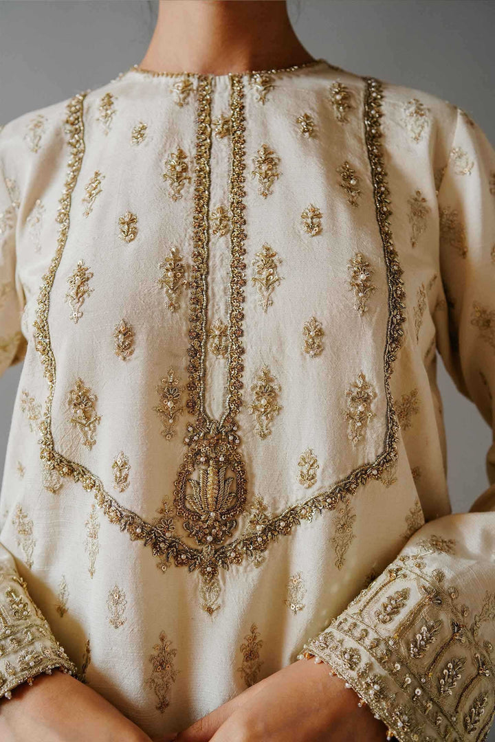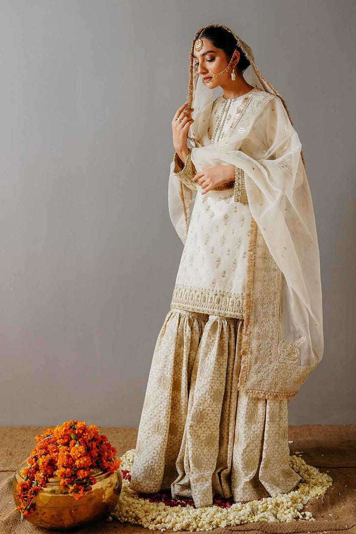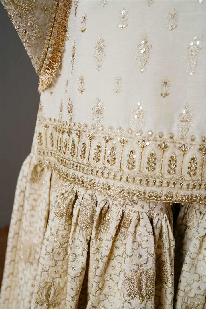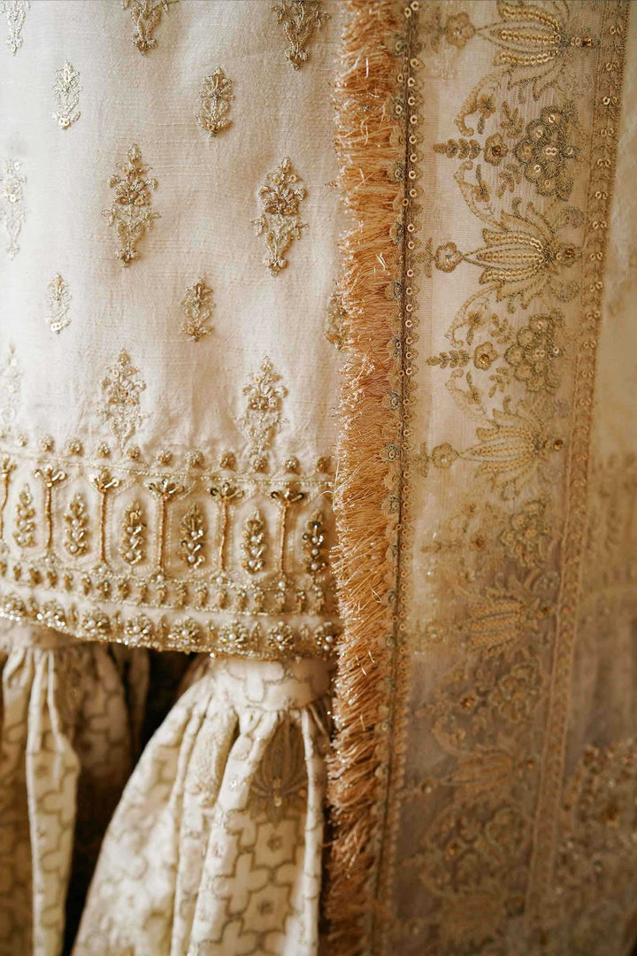 A fully embellished ivory kurta with heavily embellished neckline, borders and sleeves. It is paired with a densely embroidered gharara. The look is completed with an ivory organza dupatta with gotta work, embellished borders along all four sides, corner motives and kiran details.