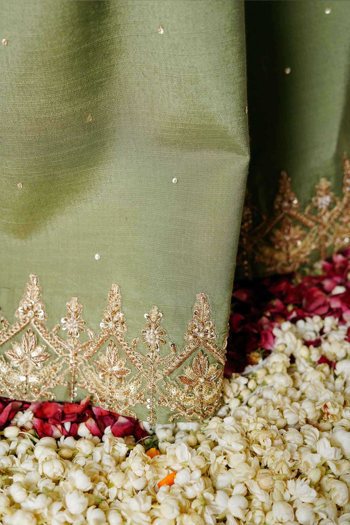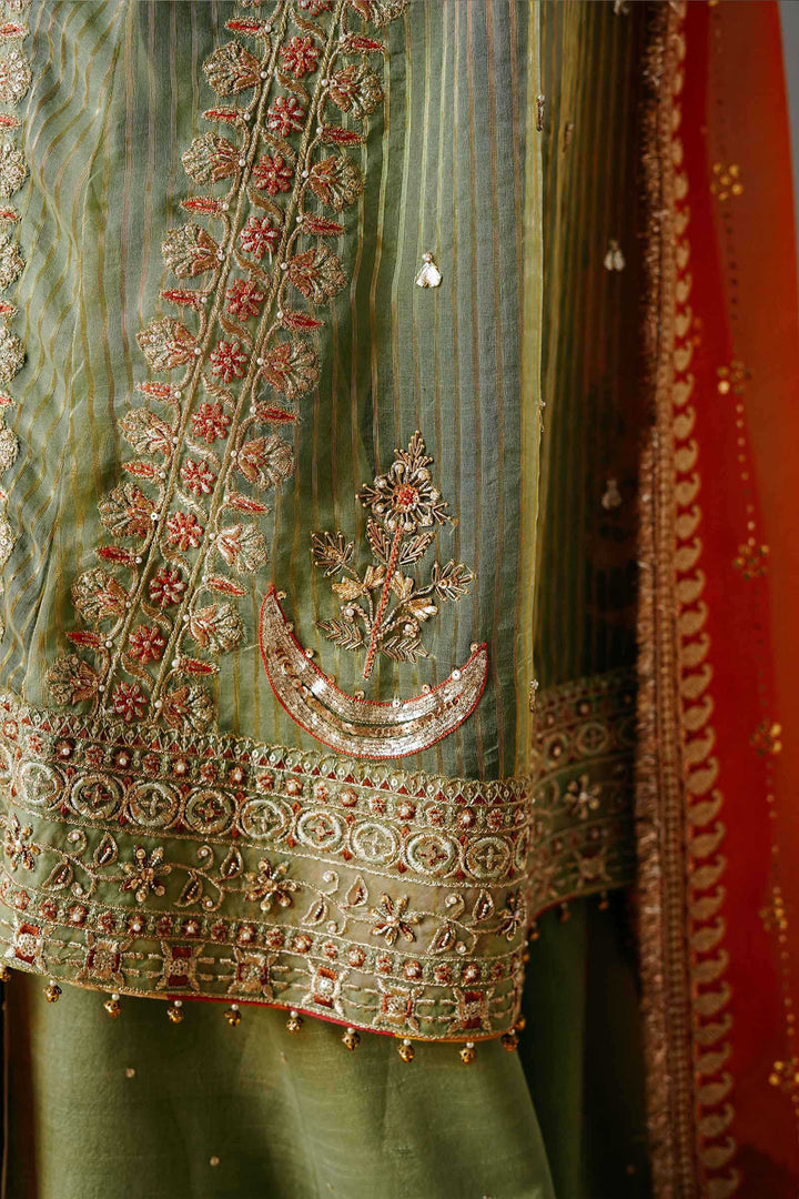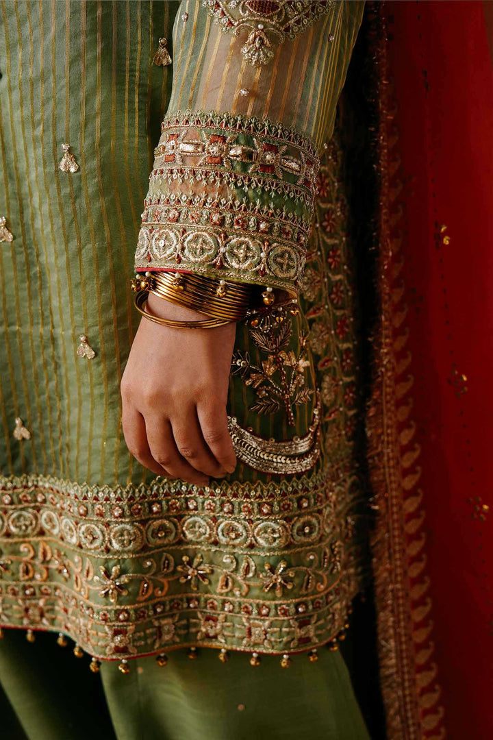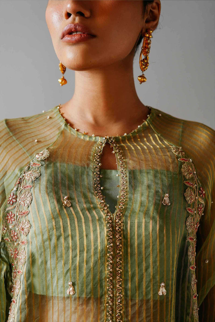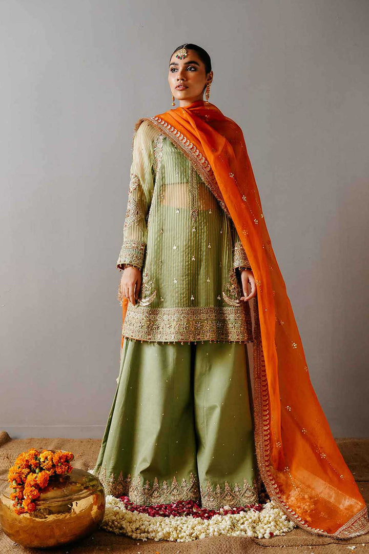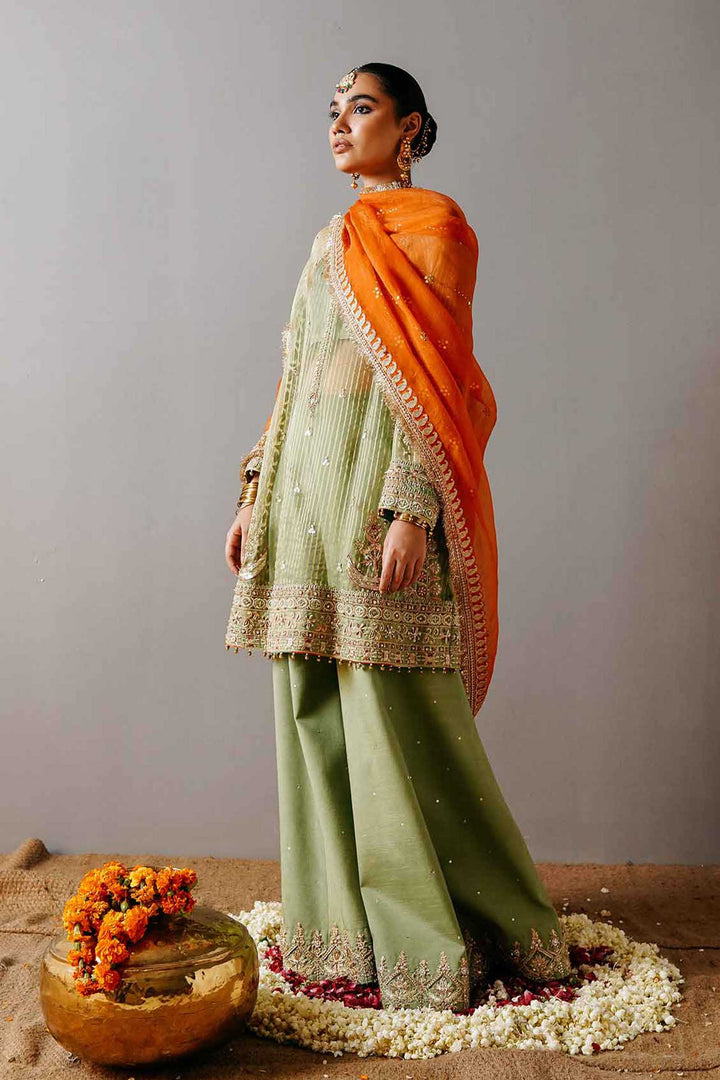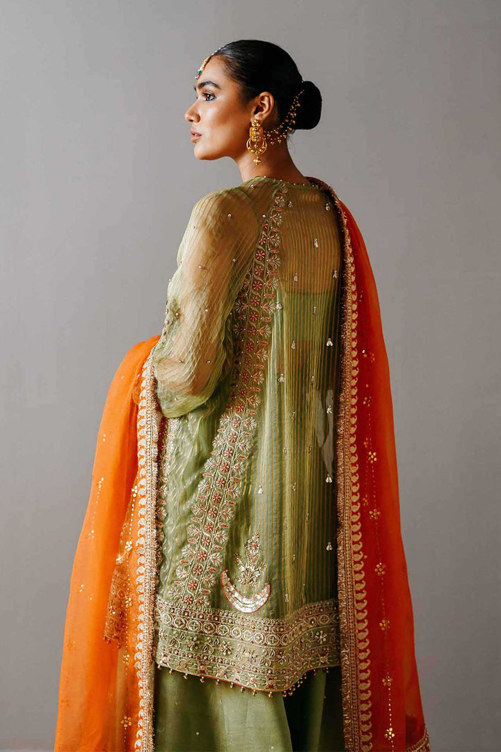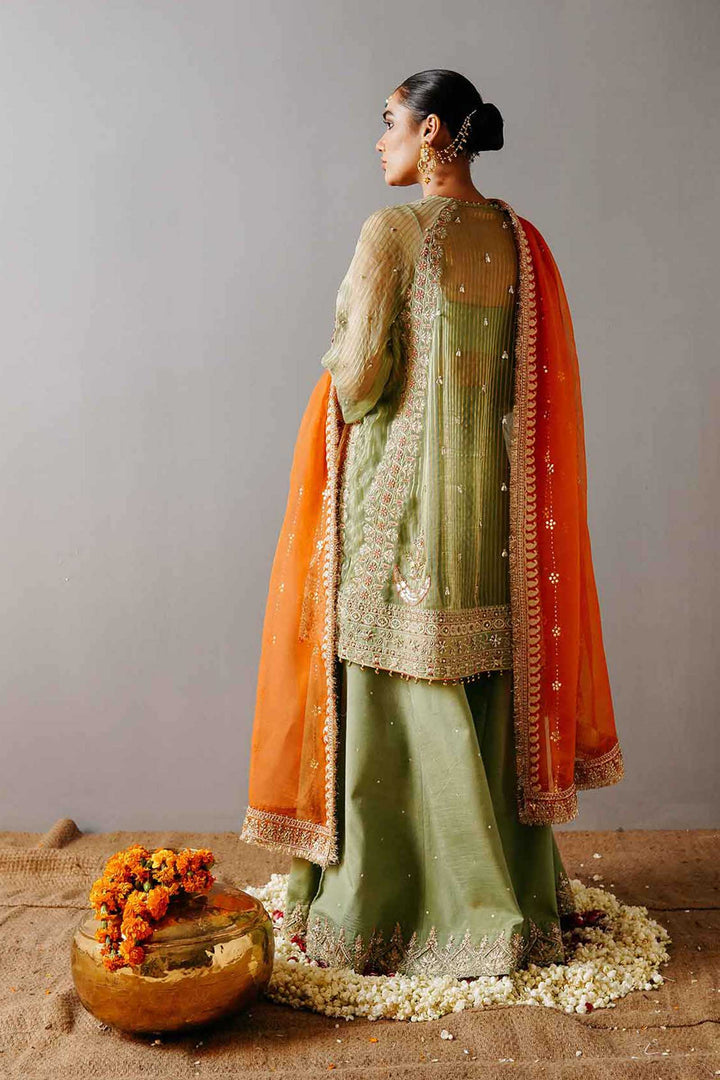 A fully embellished apple green loose fit kurta with raglan sleeves, an extensive embellished border, corner motives, composed sleeves and detailing at the neckline. It is paired with a wide legged sharara pant with a detailed border and sitara spray with a contrasting orange mukesh dupatta with borders on all four sides finished with pure kiran.