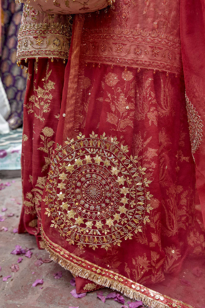 Abeera wears a pink loose-fit three paneled embellished kurta paired with a classic kamkhaab gharara with sequence embellishments. The shirt has a heavily embellished neckline and work along it’s panel lines and at the hem, and hand embellished motifs at the back and sleeves. This ensemble is completed with a beautiful pink dupatta with an embellished border and a kiran fringe along all four sides.