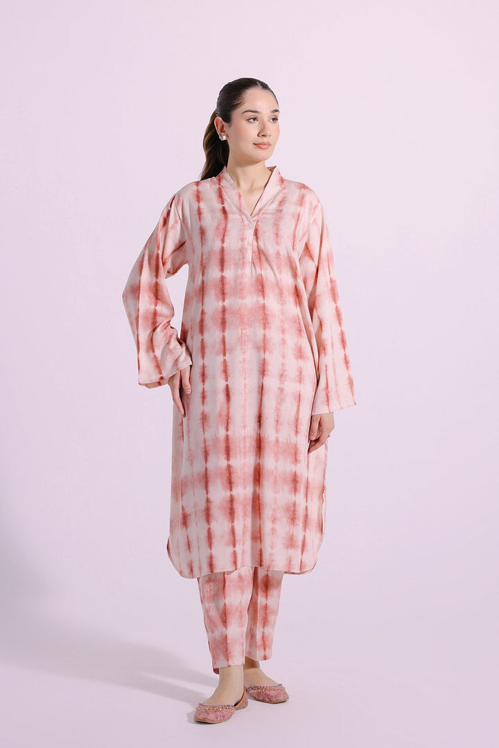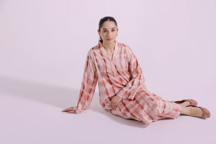 An artistically appealing composition is layered over this trendy outfit illustrating a subtle canvas. It features a chic silhouette shirt adorned with captivating tie and dye prints in vibrant coral pink tones. The chic shirt is paired with a matching trouser, this contemporary outfit is a great addition to your everyday wardrobe.