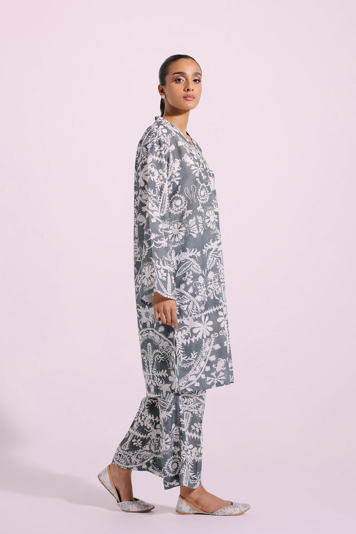 This mesmerizing outfit is aesthetically rich with its 2-piece design and viscose slub fabric. The mid grey color is layered on an elegant shirt featuring floral prints in subtle ivory hue and enhanced with trendy buttons at front. The matching flared trouser completes the style statement look, making this an impeccably gorgeous ensemble.