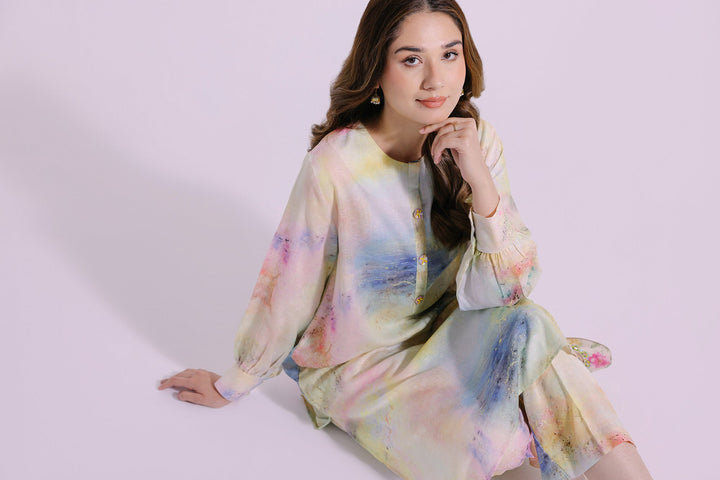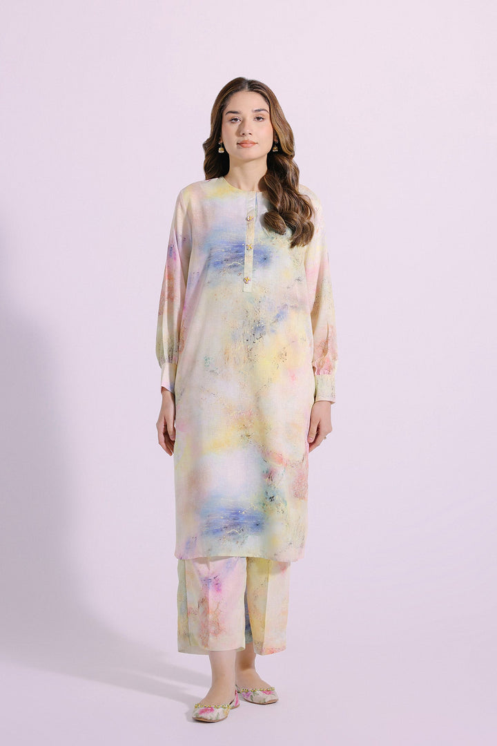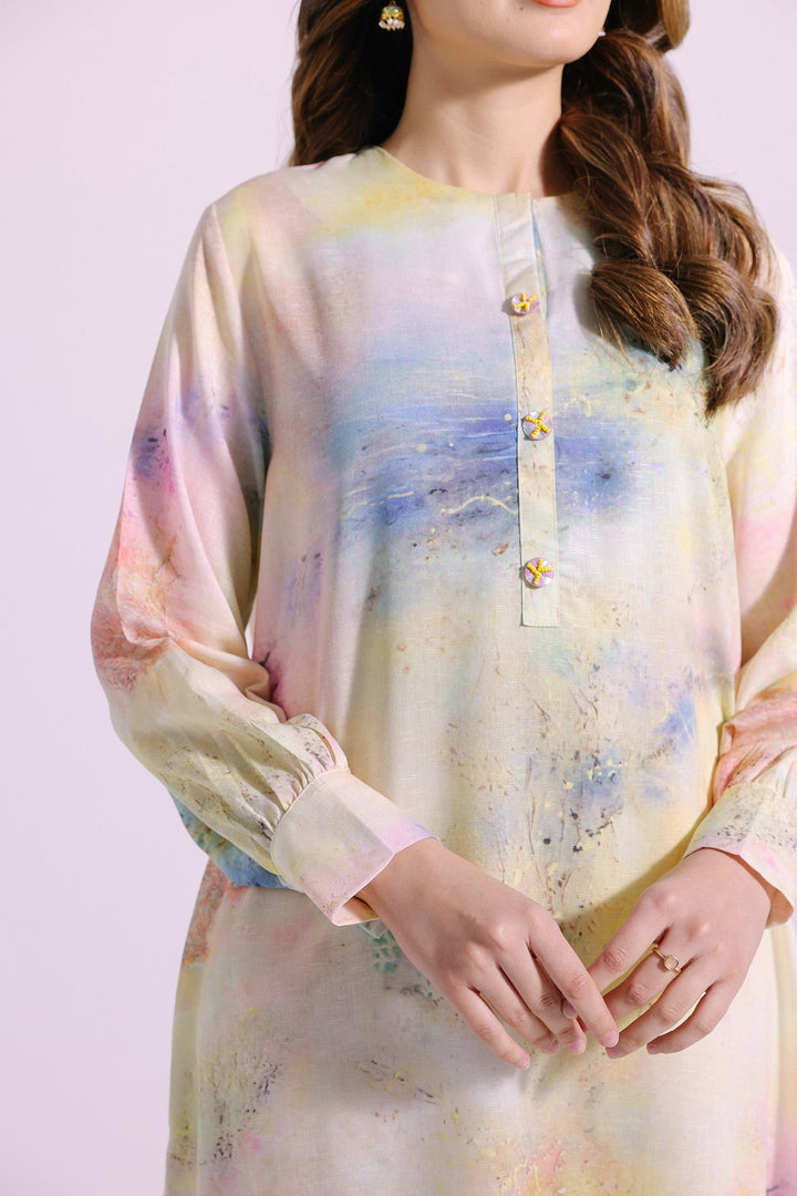 Look resplendent this season in this graceful pale yellow ensemble illustrating a gorgeous composition. This 2 piece outfit features a contemporary shirt adorned with captivating tie and dye artistic prints in flamboyant hues. Enhanced with trendy add ons at front placket, this chic shirt with cuffs is paired with a matching trouser, a great addition to your everyday wardrobe.