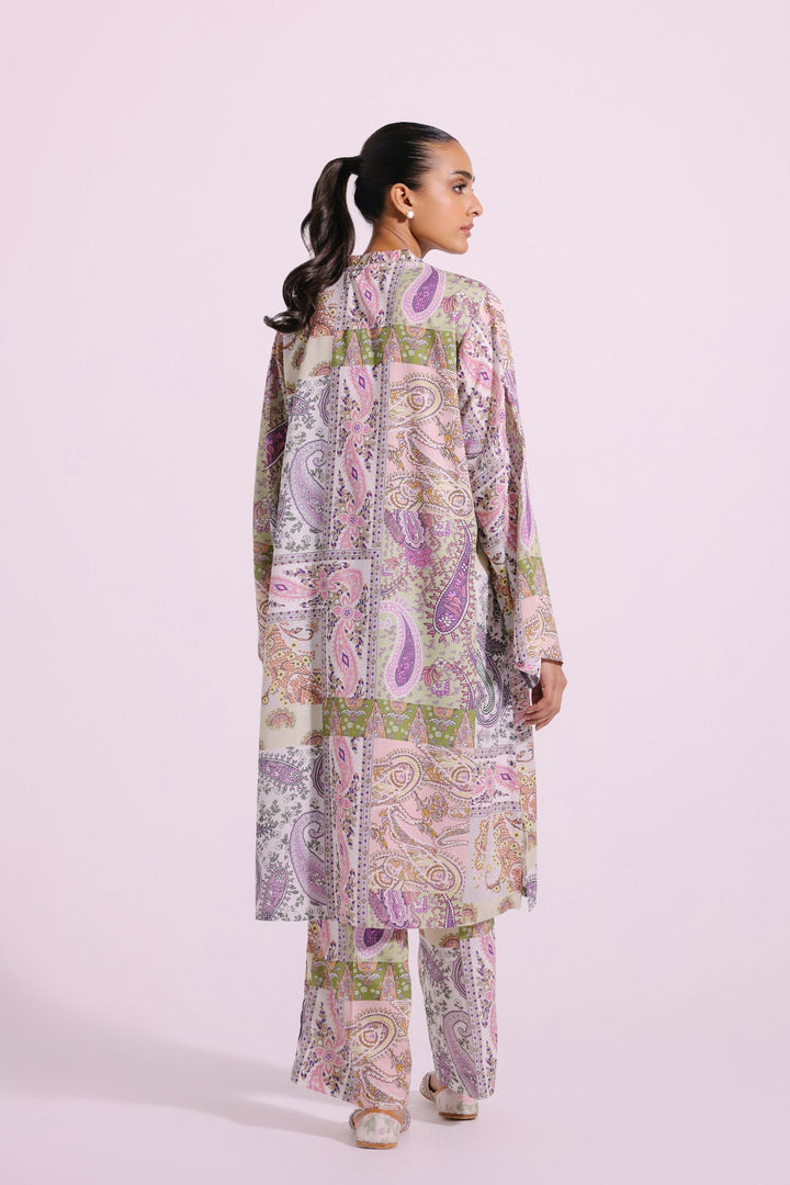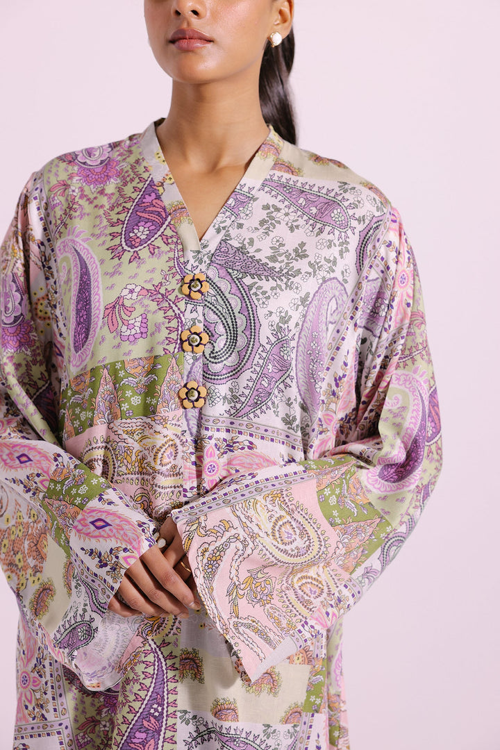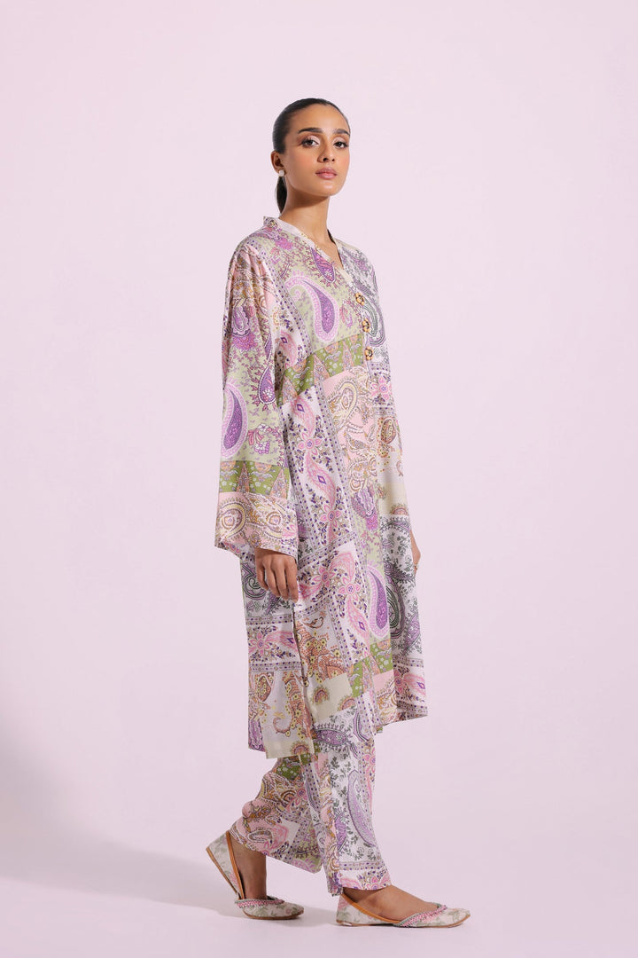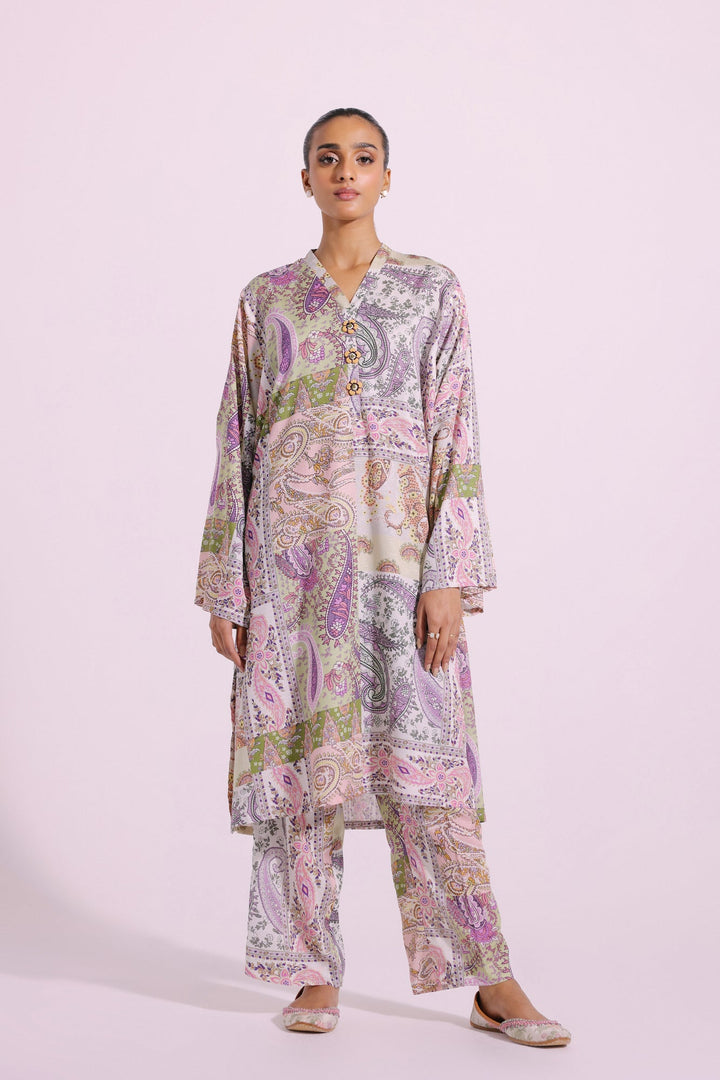 This mesmerizing ensemble features a 2-piece set with a classic aesthetic. The subtle coconut milk shirt has gorgeous paisley prints in mesmerizing hues and enhanced with trendy beads at the front. The matching trousers add a contemporary touch to this outfit, making it ideal for everyday wear during the this season.