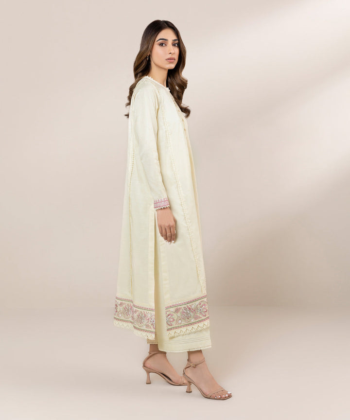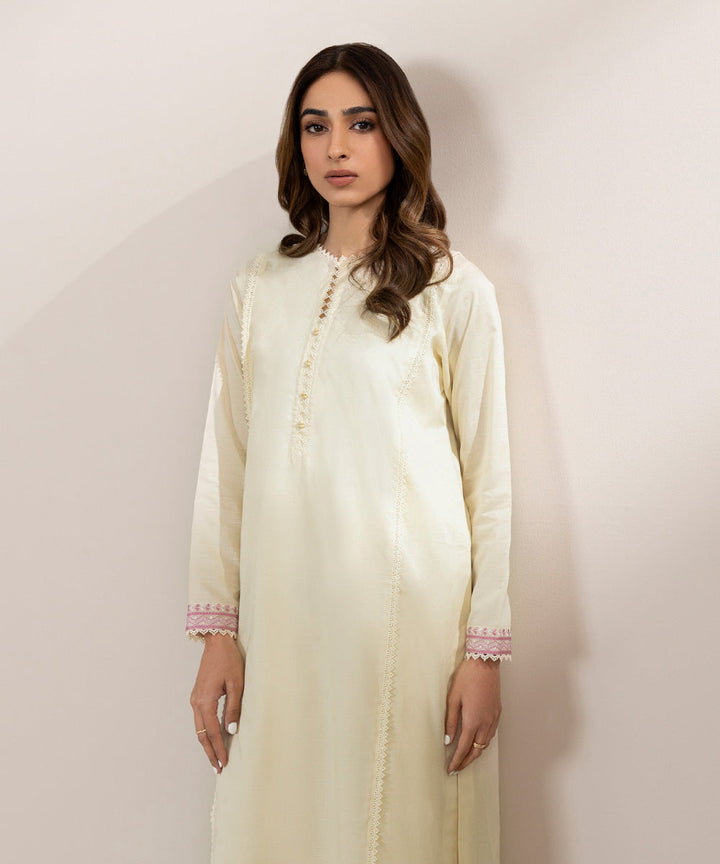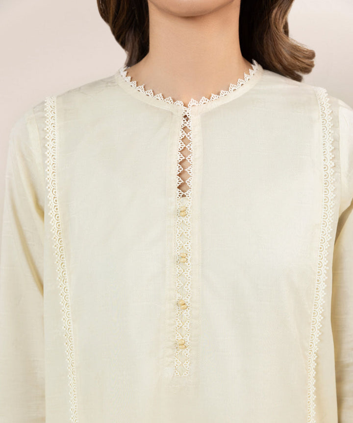 Dyed Front with Embroidery And Lace, Dyed Back with Embroidery And Lace, Full Sleeves, Crew Neckline with a slit