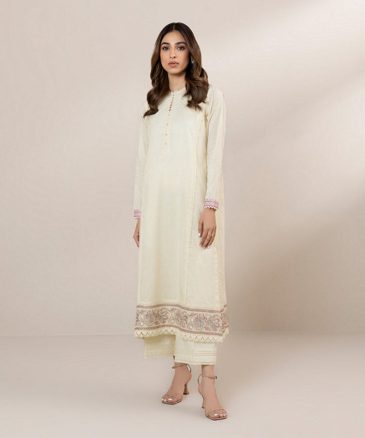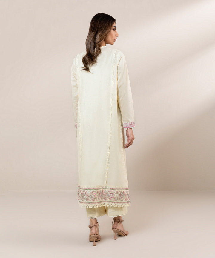 Uplift your daily style with our cream white A-line silhouette featuring intricate patterns.