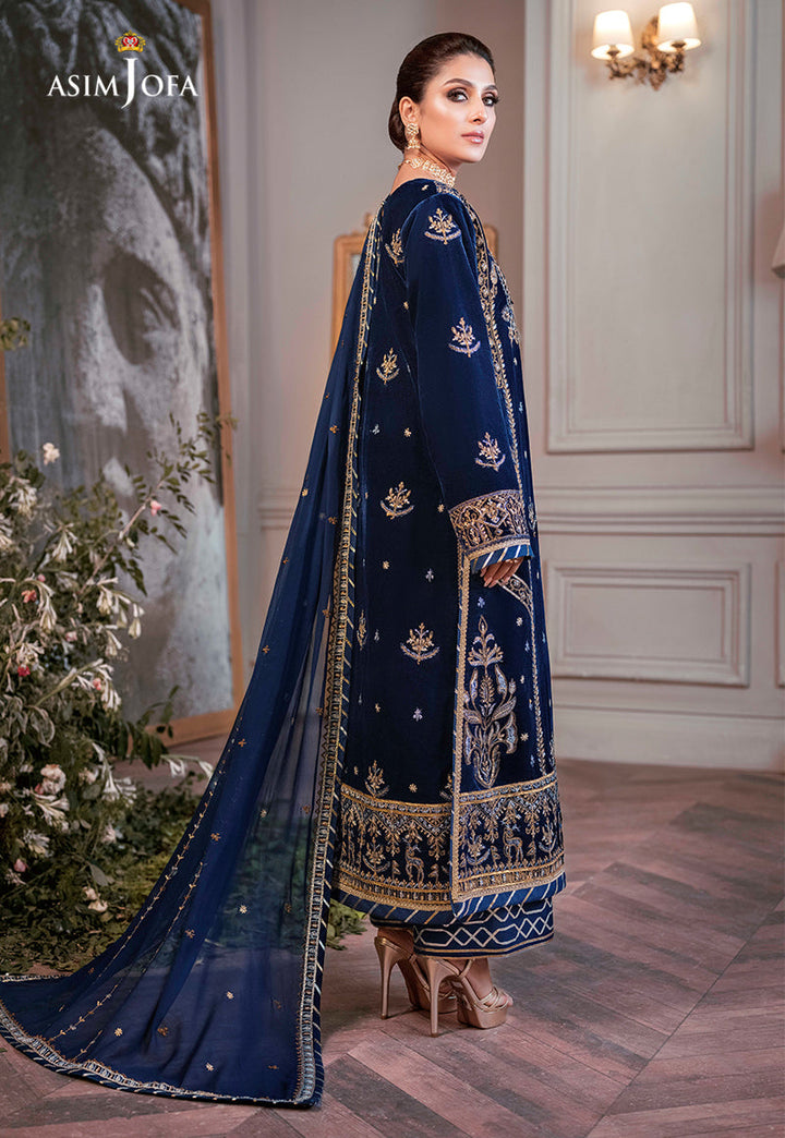 Sapphire: A regally timeless design is curated involving three techniques of embroidery bringing together the intricate antique zari and marori work meshed with shiny silver lorex creating a beautiful ganga jamni effect further enhanced by gota inserts dusted with dainty sequins coming alive on deep blue velvet base. Intricately embellished chiffon dupatta and dyed pants round off this rich design.