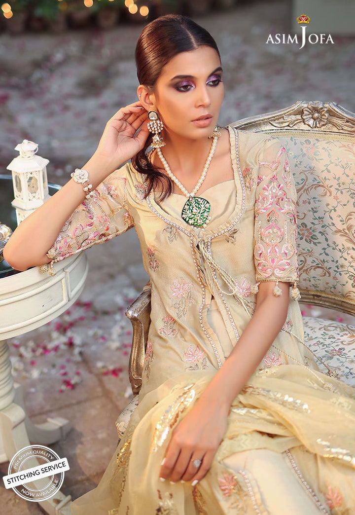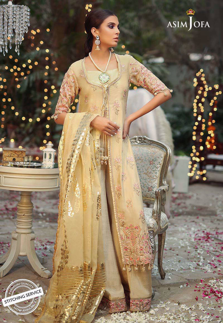 A perfect summer beige and gold ensemble. Embroidered front back and sleeves with artistically rendered floral details. Dazzled with a blend of gold sequins and paired with gold foil dupatta on organza and raw silk pants. A muted and sophisticated color palette for a glamorous yet elegant look.
