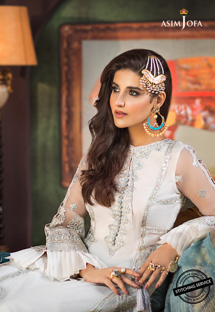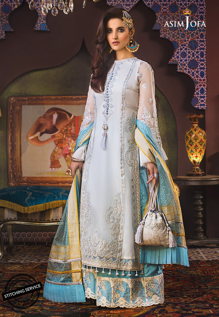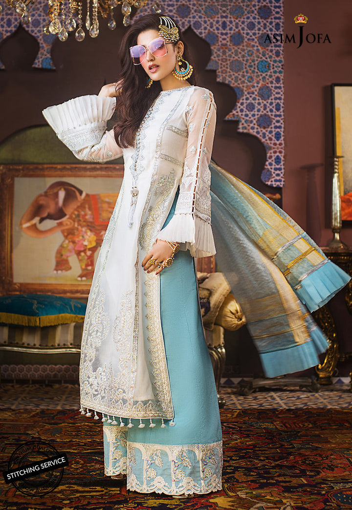 Oozing luminance this ensemble creates an ethereal vibe, filigree embroidery done on white organza in ganga jamni with tint of ice blue complemented by woven organza dupatta and dyed raw silk lower provided with elaborately embroidered border which can be made into a dhaka pajama or lehenga.