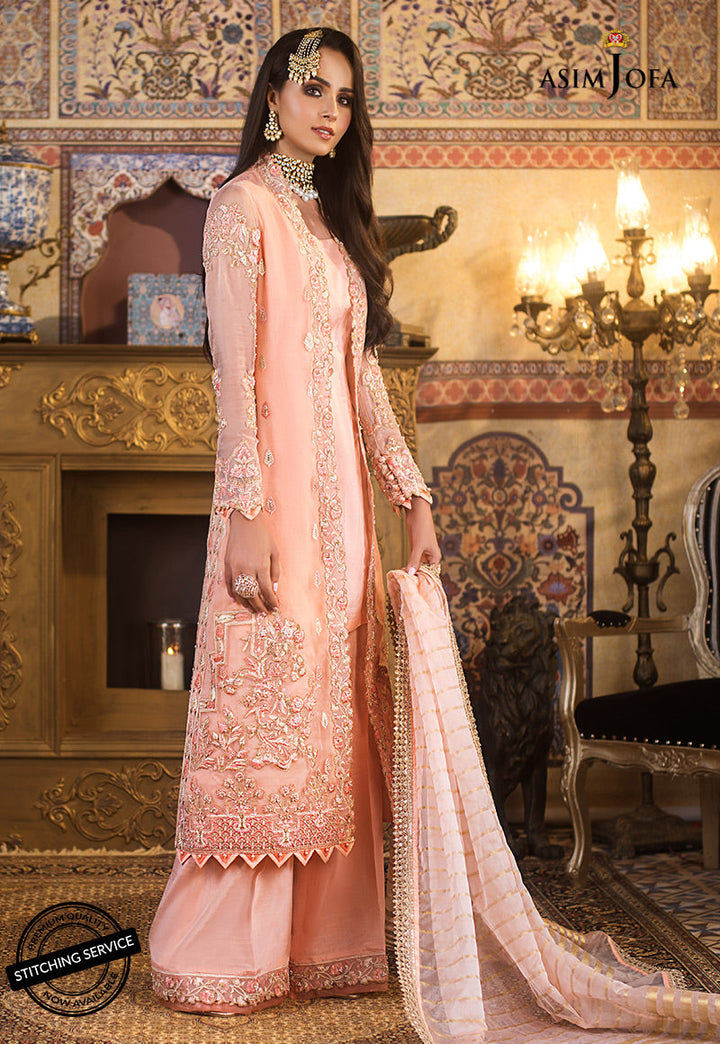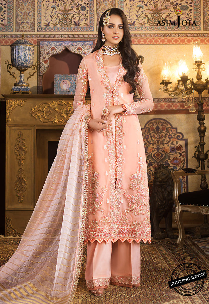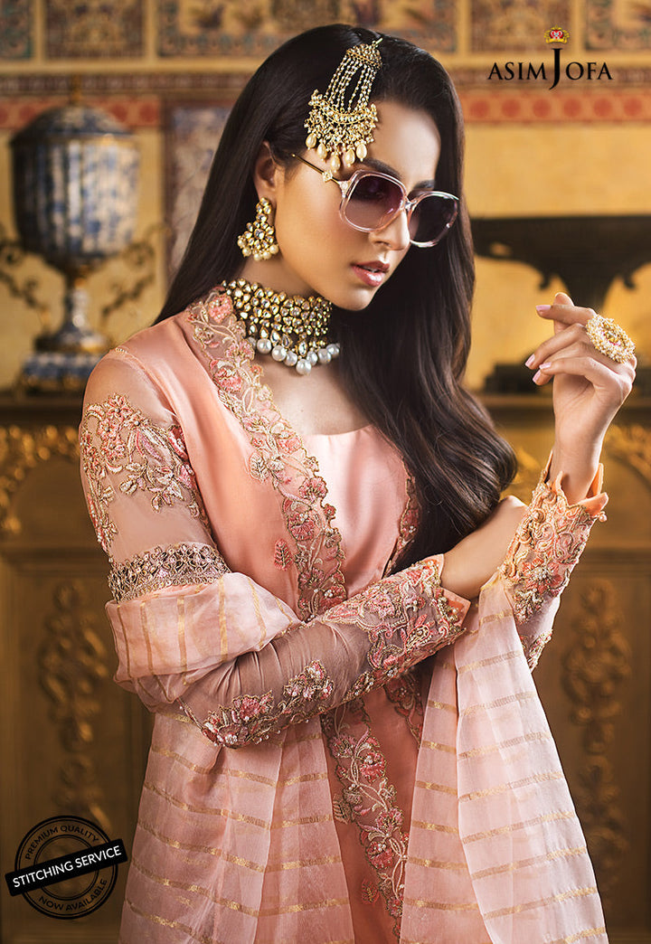 Like a fresh breath of air this peach ensemble exudes soothing vibes. A beautifully designed front open cape intricately worked in filigree embroidery pattern topped with tiny pearls and kora hand touched delicately adding more allure to the design. It comes with a woven organza dupatta and same hued boot cut pants with embroidered ending on hem.