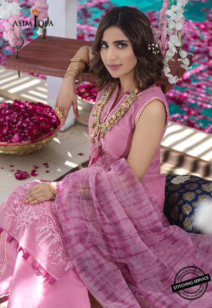 Beat the heat with this beautiful sleeveless clean straight cut shirt. An interesting take on monochromatic color scheme of rosy pinks accentuated with brilliant threadwork along the front crowned with sheer organza embroidered hemline. A shibori inspired digital print organza dupatta is completed with wavy line appliques on pallus and solid dyed pants. This design is a season favorite as its comfortable yet stylish suitable for all day affairs.