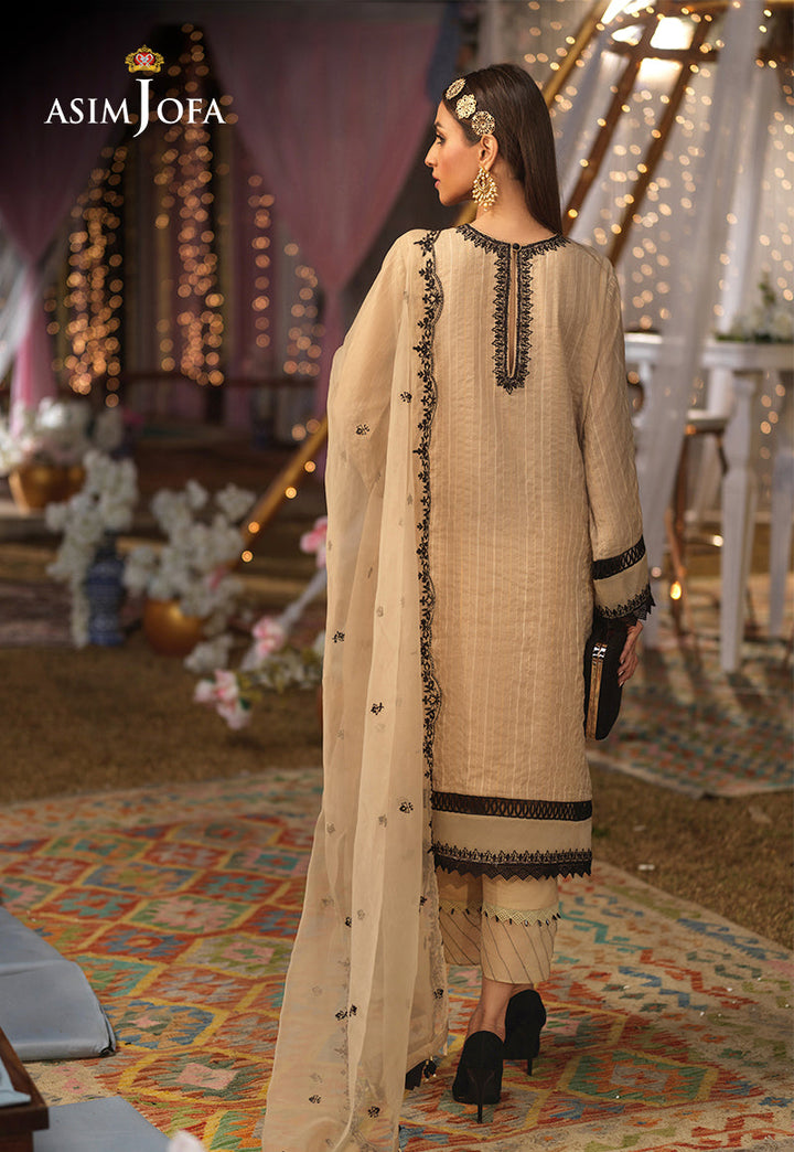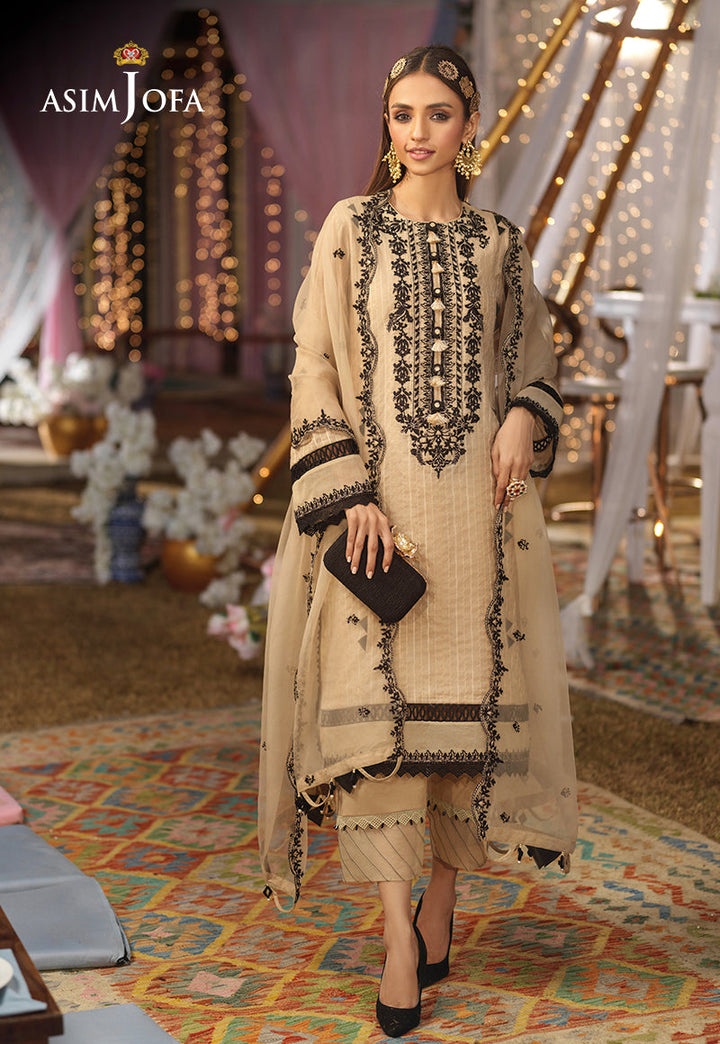 This summer favorite beige ensemble is a stand-out look for any casual day, the melodious combination creating a story between delicately woven jacquard and single color embroidery makes it a perfect statement look with a beautiful neckline and embroidered borders. Paired with a gorgeous embroidered scalloped organza dupatta and dyed pants. Pair it with a bold attitude and be a style maven.