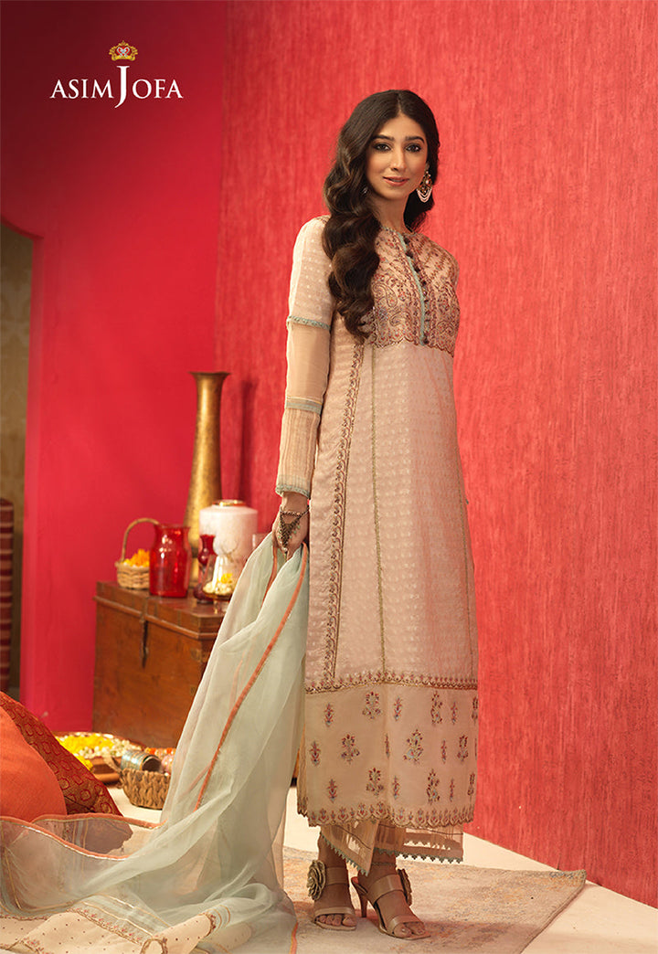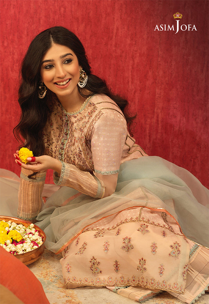 Softness personified Mariam Nafees breathes a life in this design with her innocent charm. A fresh peach tint Cotton Jacquard paneled shirt woven with small polka dots becomes the base of this design. A heavy square neckline is worked in shades of soft coral, mint & raisin colored threads with addition of light gold zari & cupped Sequins. Its matching scattered motif style wide border with mini scallops running along the front daman, the back daman border is inserted with pleating details to enhance embroidered borders on its edges. This design comes with muted mint Organza dupatta trimmed with peach colored embroidered pallus. Flared Silk palazzo with fabric manipulation on its hem completes the look of this design.