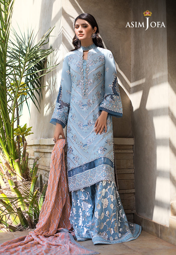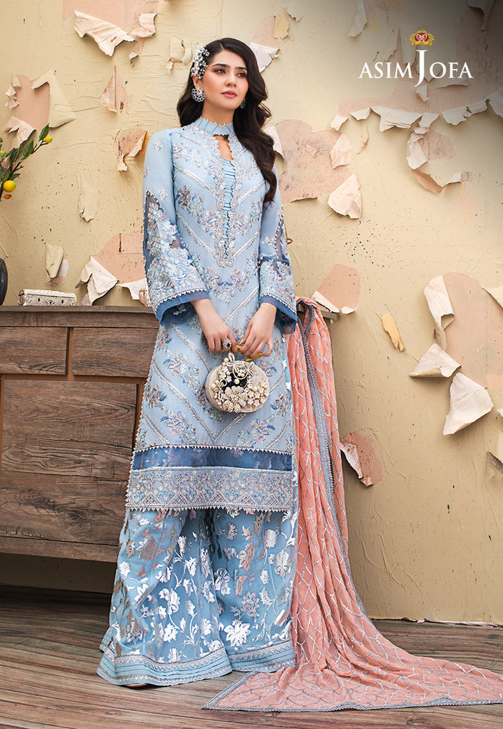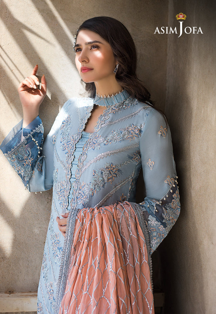 She is a vision to behold Dur-e-Fishan looks ethereal in this stunning ensemble. A heavily embellished shirt worked in pastel threads, silver zari, sequins and hints of dori. A peach hued embroidered chiffon dupatta and luxurious silver foil printed  net bottom give this design an extra oomph.