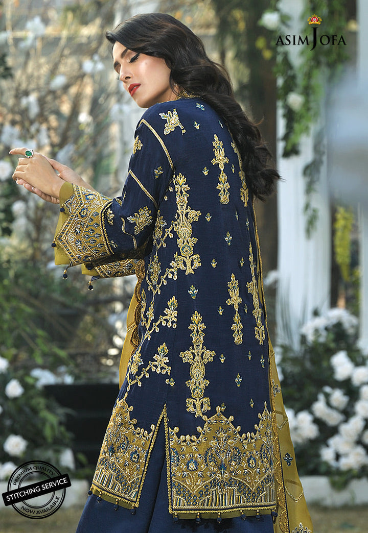 Cocoon yourself in gilded richness of this beautiful sapphire hued silk rendered in mustard gold, aqua and golden zari hinted with mirror work detail in chevron style embroidery pattern. This design boasts an embroidered chiffon dupatta and borders made on mustard color creating an appealing contrast with solid dyed silk pants..