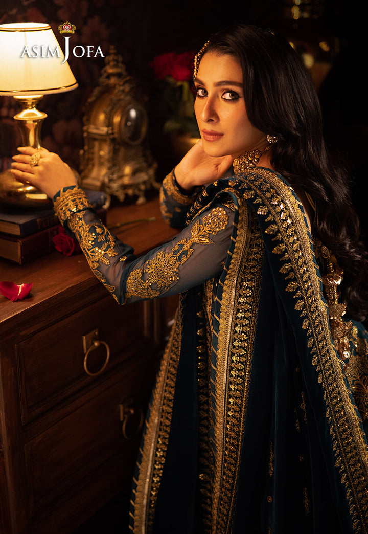 Embrace the majestic vibe of this teal ensemble, adorned with antique gold zari and gold cupped sequins, creating a splendorous display of intricate embroidery. The embroidered shirt showcase opulence in every stitch. The embroidered daaman and motifs on the sleeves add the richness in the design. The embroidered velvet shawl with two side borders and motifs at the pallu corners, is a regal masterpiece, making it a celebration of antique gold splendor.