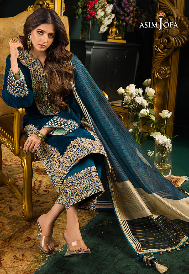 Rich teal velvet is rendered in rose gold embroidery with a touch of luminance from iridescent sequins. Its fashioned in a sleek long cut heavily embellished complemented by dyed trouser and woven dupatta.