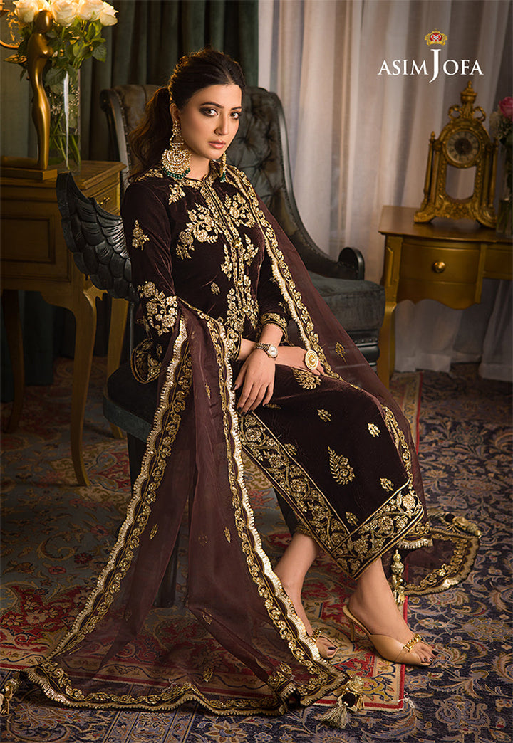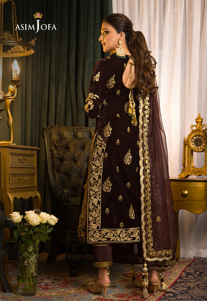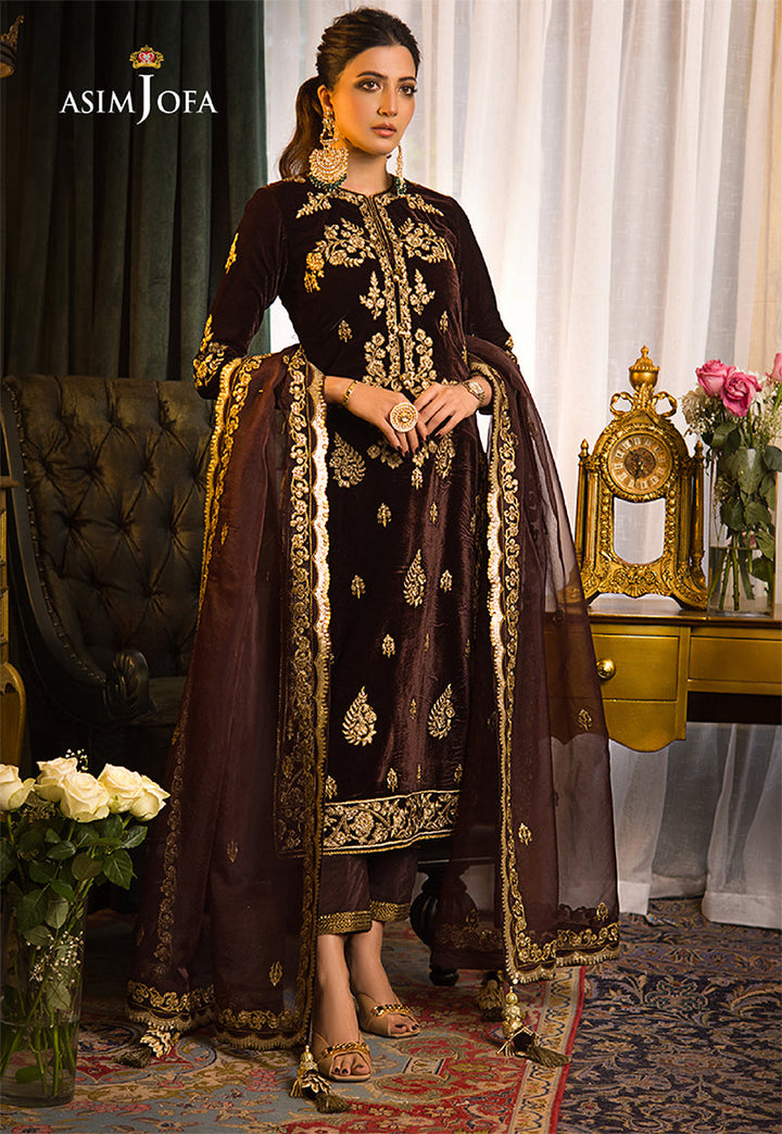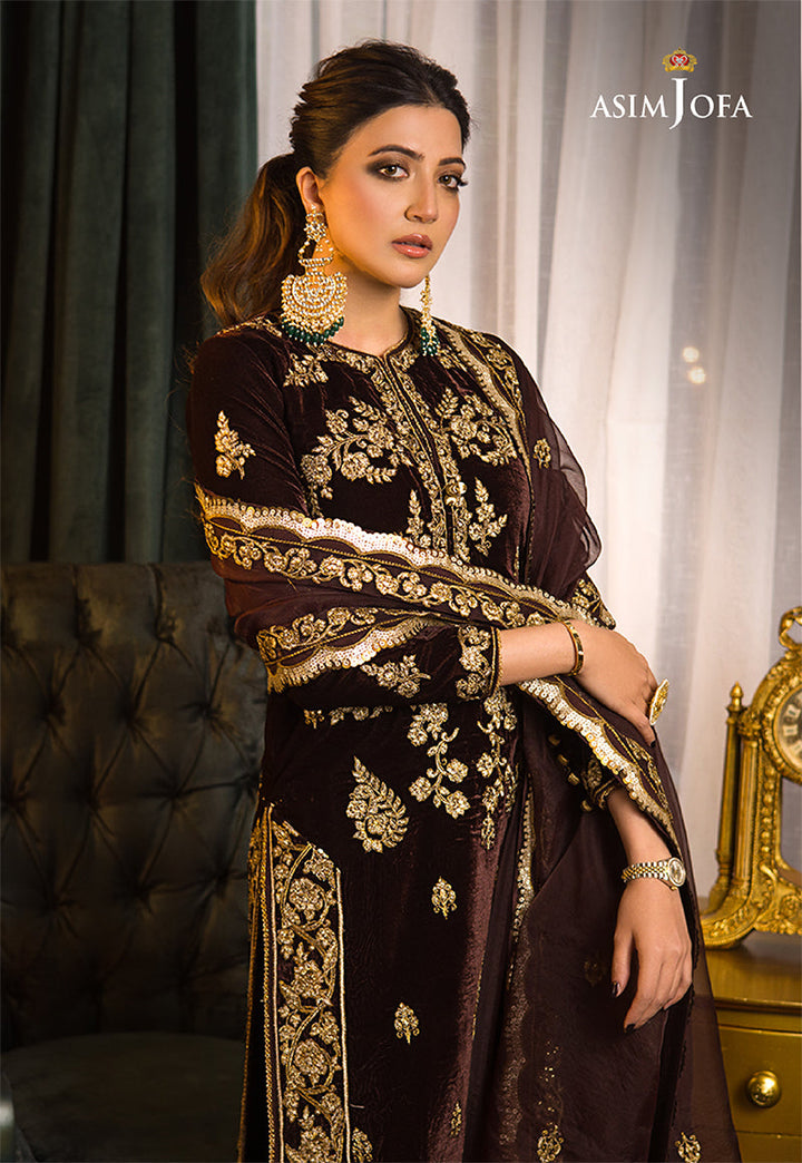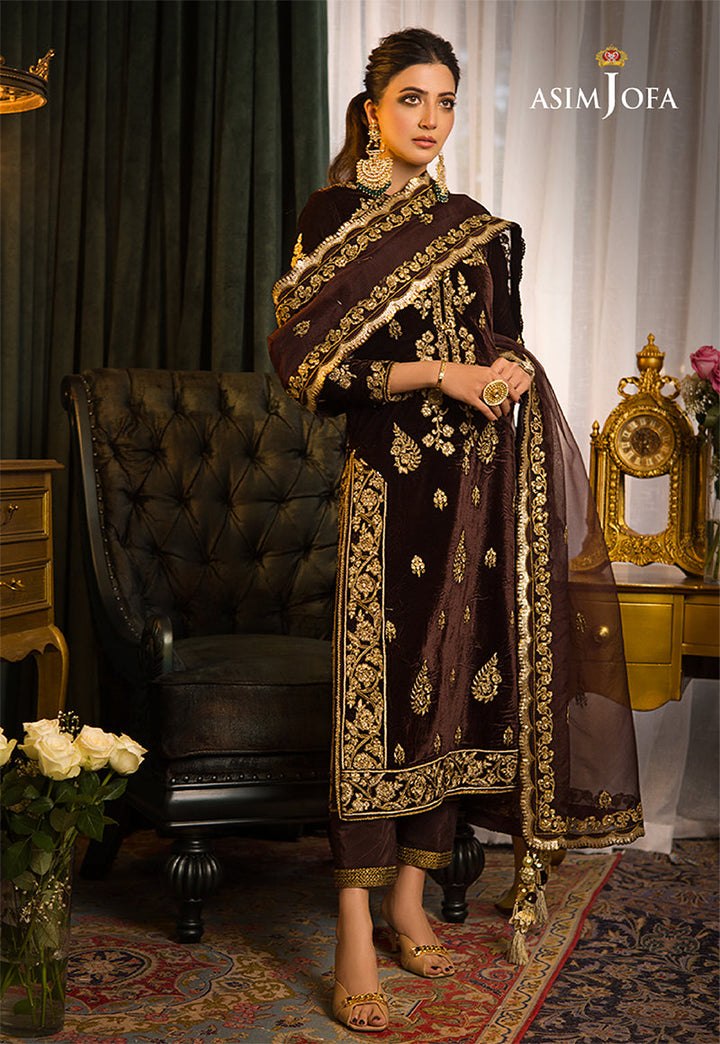 Blow everyone away wearing this stunning design. A deep chocolate brown velvet is decorated with heavy embroidery done in antique zari and beige thread punctuated by sequins inserts. It comes with dyed silk trouser and embellished organza dupatta.