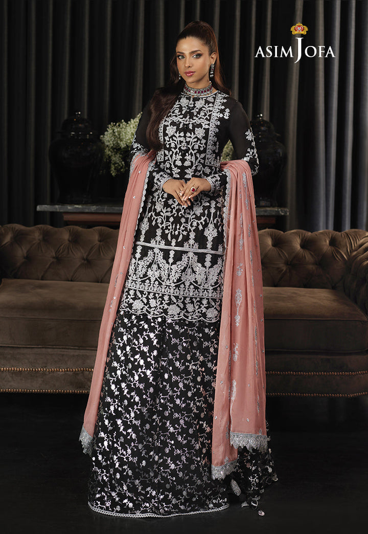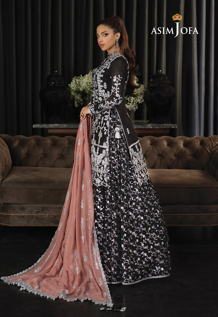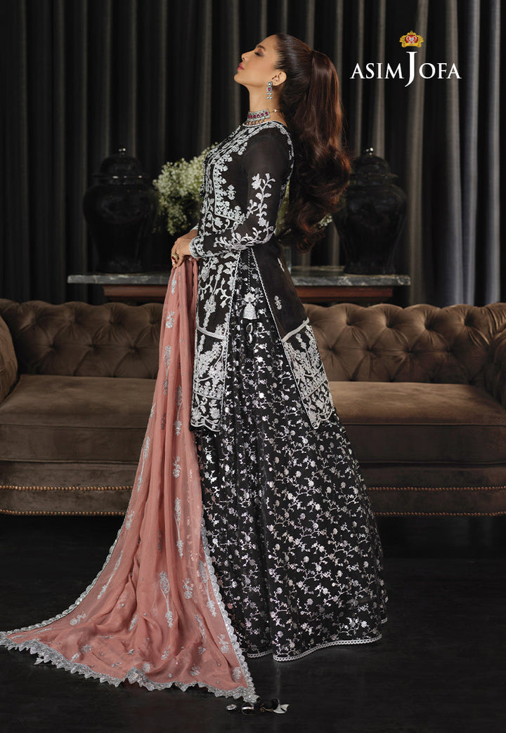 Sonya Hussyn slays donning this amazing noir ensemble. Heavy silver dori is coiled in beautiful floral pattern on black silk base creating a filigree pattern reminiscent of the age old craft of marori but done with a new twist. A flowy lehnga complements with silver foil printed tulle backed by a splash of tea pink color in the form of chiffon embroidered dupatta. Everyone will be awestruck with this stunning design.