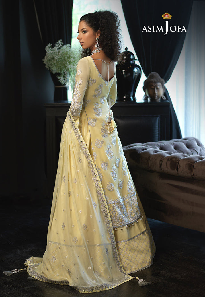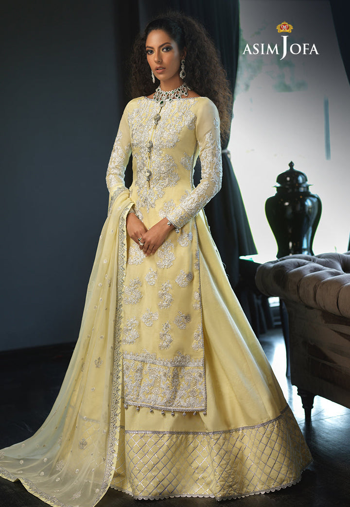 Dressed in pale buttercup yellow Nimra Jacob glows. Ivory dori works its magic on silk base combined with silver zari and sequins creating a beautiful shirt with a spread of small and big motifs all-over topped with a heavy neckline and borders on hem. It includes a chiffon embroidered dupatta with dyed silk lehnga.