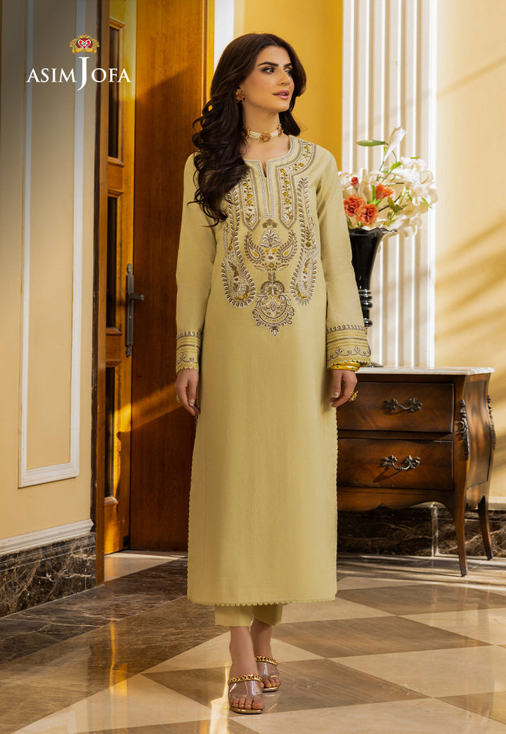 In this charming creation from Asim Jofa’s Essentials collection, the delicate leek green hue of the cambric shirt and trousers brings a fresh, spring-like quality to the ensemble. The embroidered center panel and sleeve borders, executed with artistry and finesse, add depth and texture to the design. The plain dyed cambric on the sides, back, and sleeves provides balance to the overall look, while the cambric trousers bring a touch of practicality and versatility. Together, these elements create a harmonious and well-crafted ensemble that exudes effortless elegance.