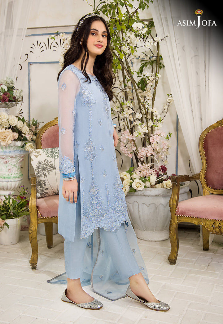 Look effortlessly chic in our pastel blue organza ensemble! The scallop knee-length shirt and narrow pant are a perfect fit, and the Resham, Zari, and Sequin embroidery with floral motifs in ice blue adds just the right amount of detail to this opulent outfit.