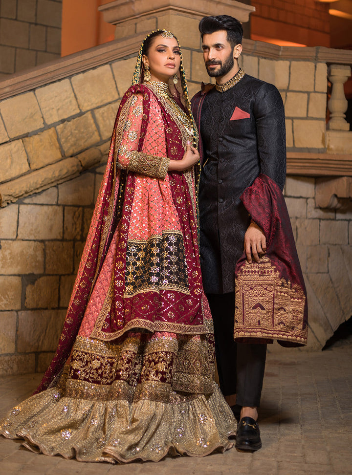 Our black jacquard sherwani allured with embellished collar, sleeves border and maroon pocket square is all set to make you chic yet elegant.