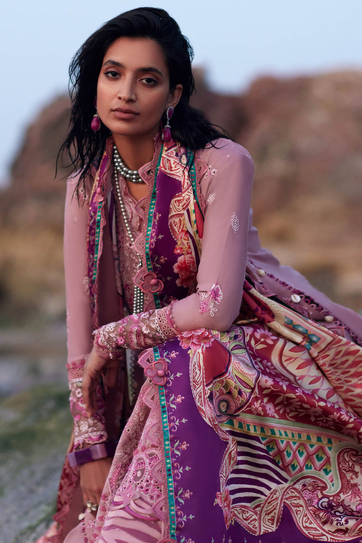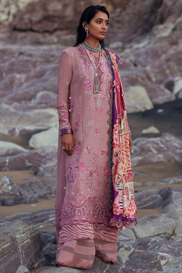 A blush pink base is set off with intricate floral embroideries in contrasting shades of ecru, rogue, blush and mulberry in ‘Fezeh’ Paired with an artsy pure medium silk dupatta depicting vareying hues of pinks, scarlet, aubergine, Laguna, ivory and azure, this feminine and flattering design is well suited to create a dreamy look.