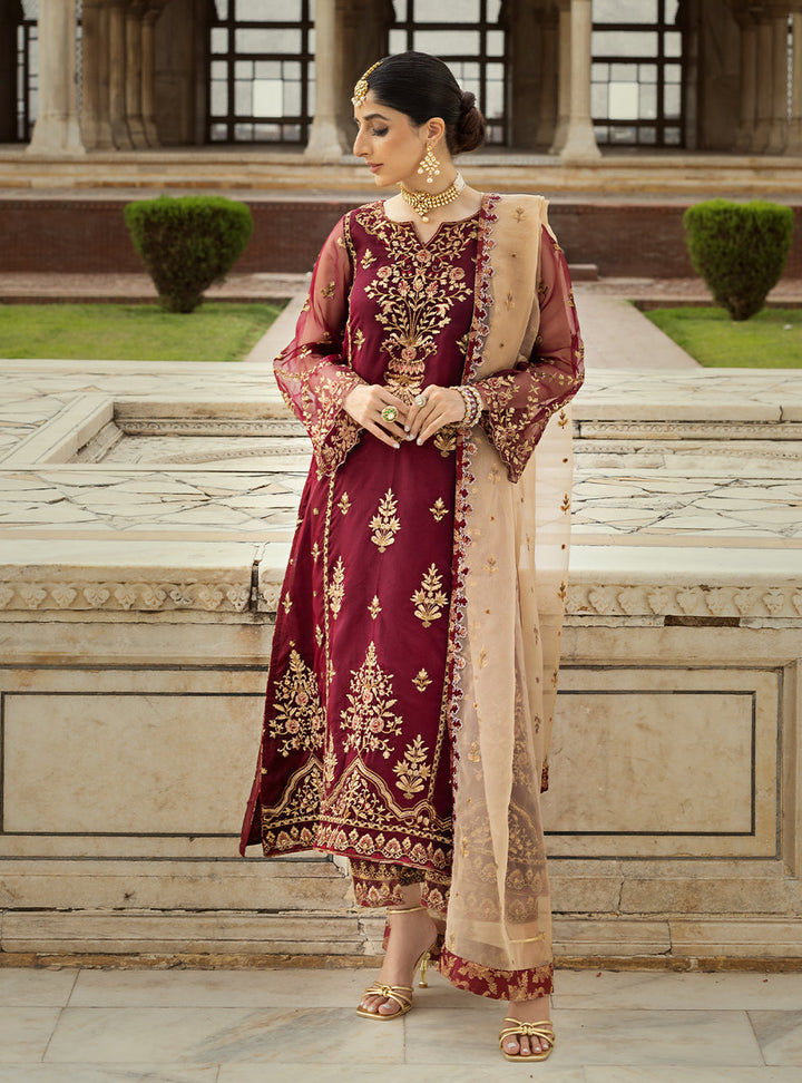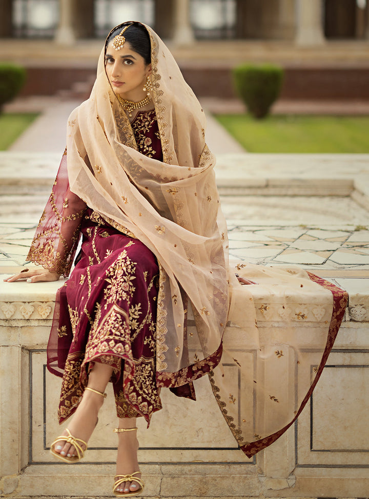 Jahanara embodies an exquisite blend of elegance and grace, lavishly adorned on a floral canvas meticulously embellished with sequins and resham embroidery, culminating in a majestic ensemble.