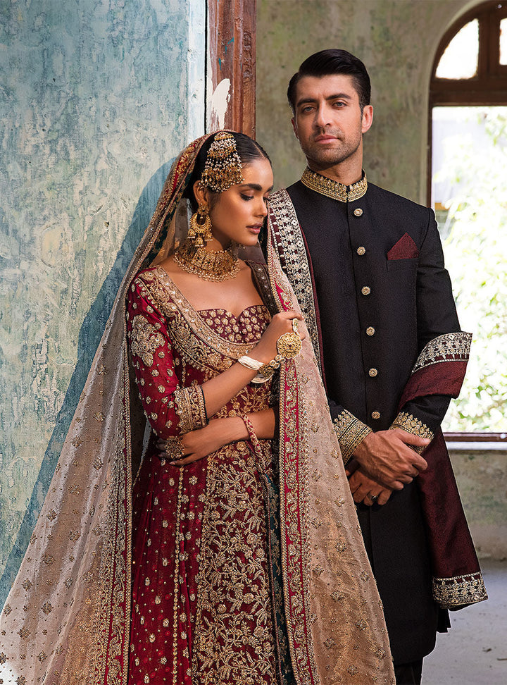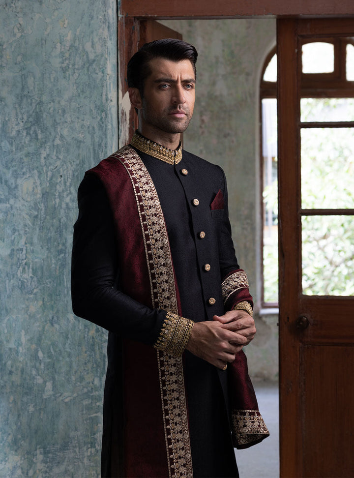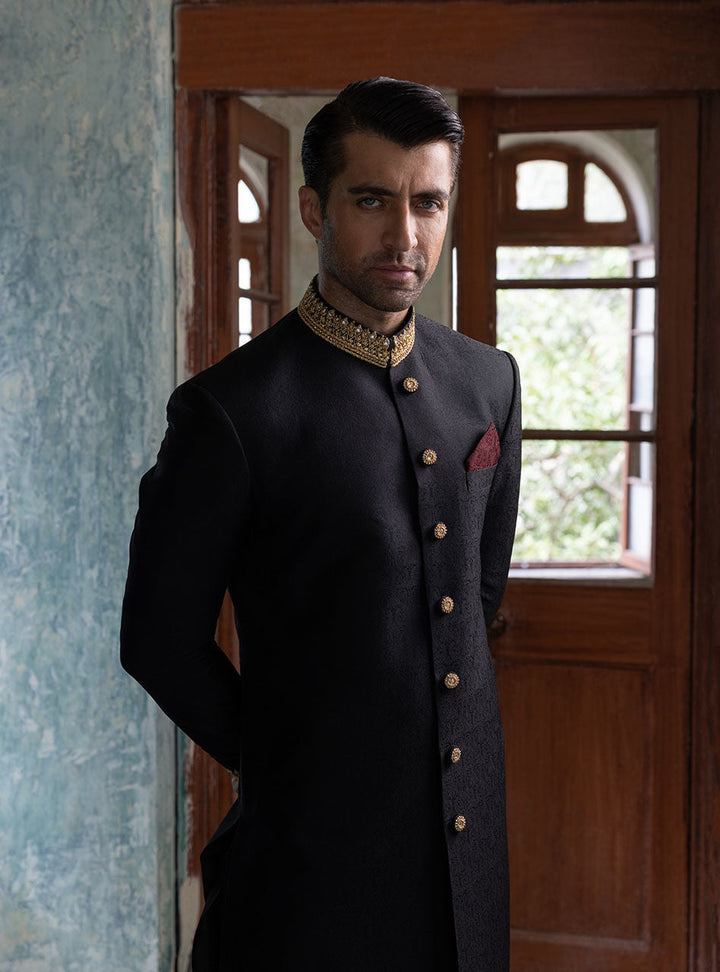 This black sherwani is intricately decorated with embellishment around the collar and sleeves.