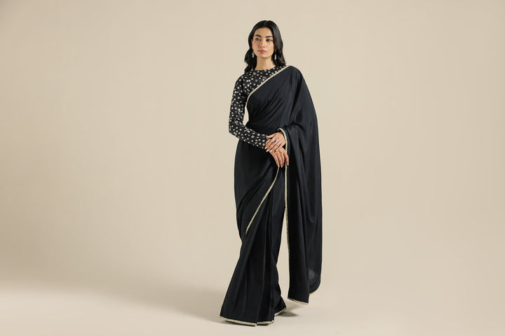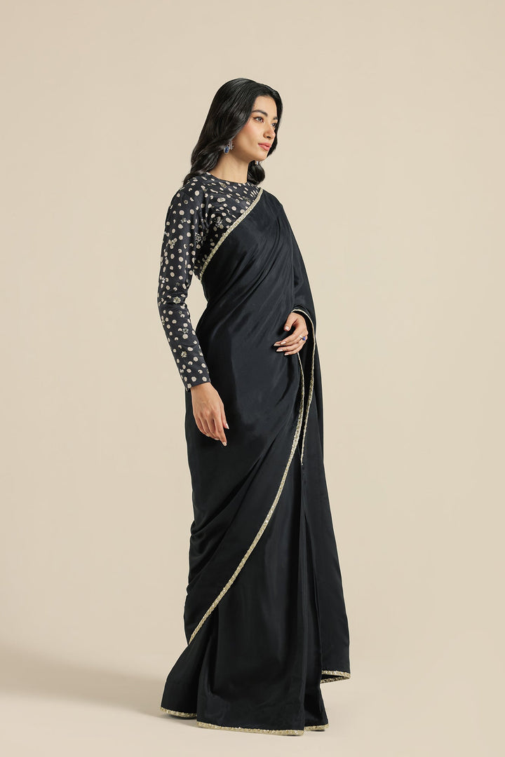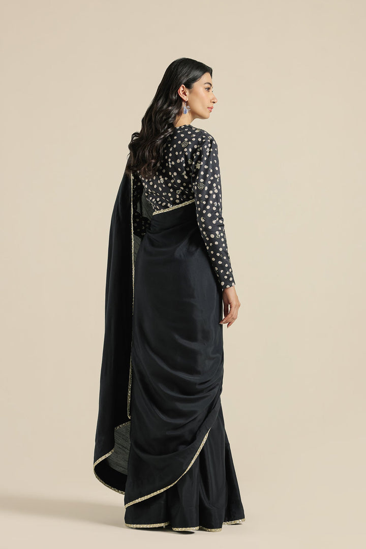 Style like a diva in this graceful saree rendered in a deep black shade and illustrating a stunning look. Showcasing a solid saree adorned with scintillating lace at edges and paired with a contemporary silhouette blouse enriched with captivating pattern printed in ivory white hues and embellished with sequins details. Look alluring in this classy saree and be the epitome of grace this festive season.