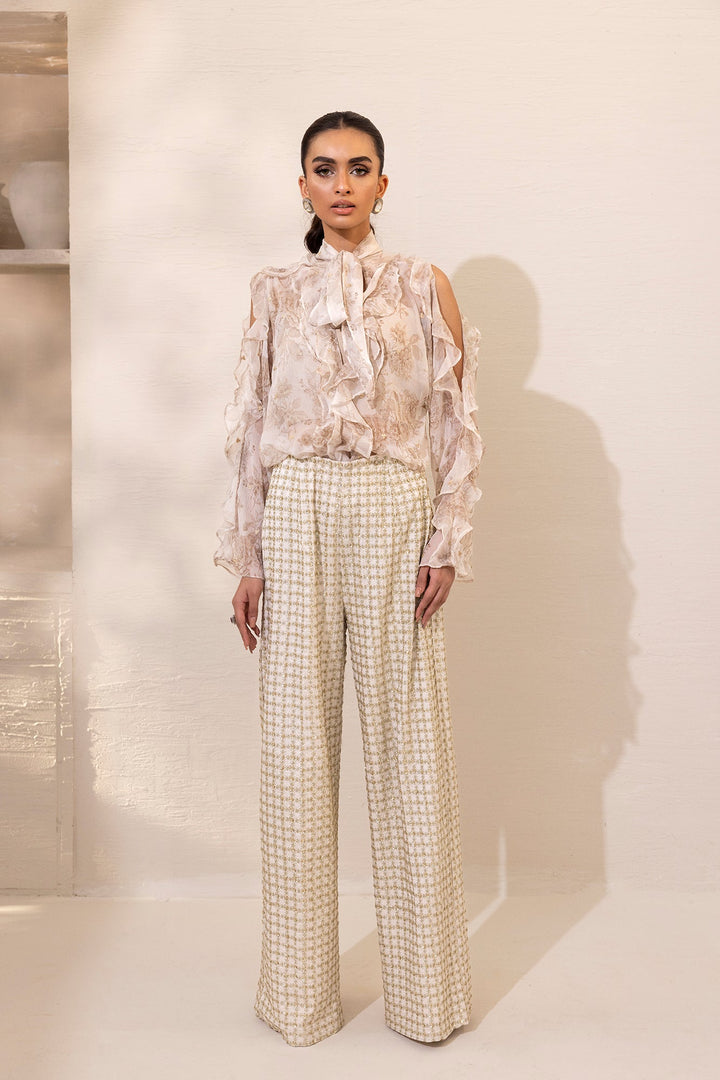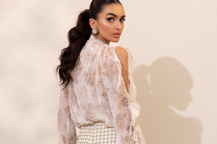 This sophisticated top is perfect for making an attractive statement. It features an experimental silhouette with cold shoulders and enhanced with frills and bow tie at front neck. Beautifully adorned with floral prints in monochromatic shades and paired with an inner slip, this trendy piece is sure to add a touch of elegance to any wardrobe.