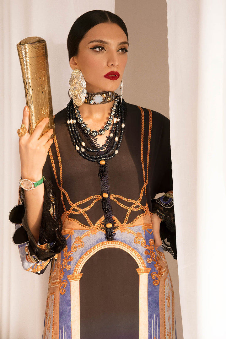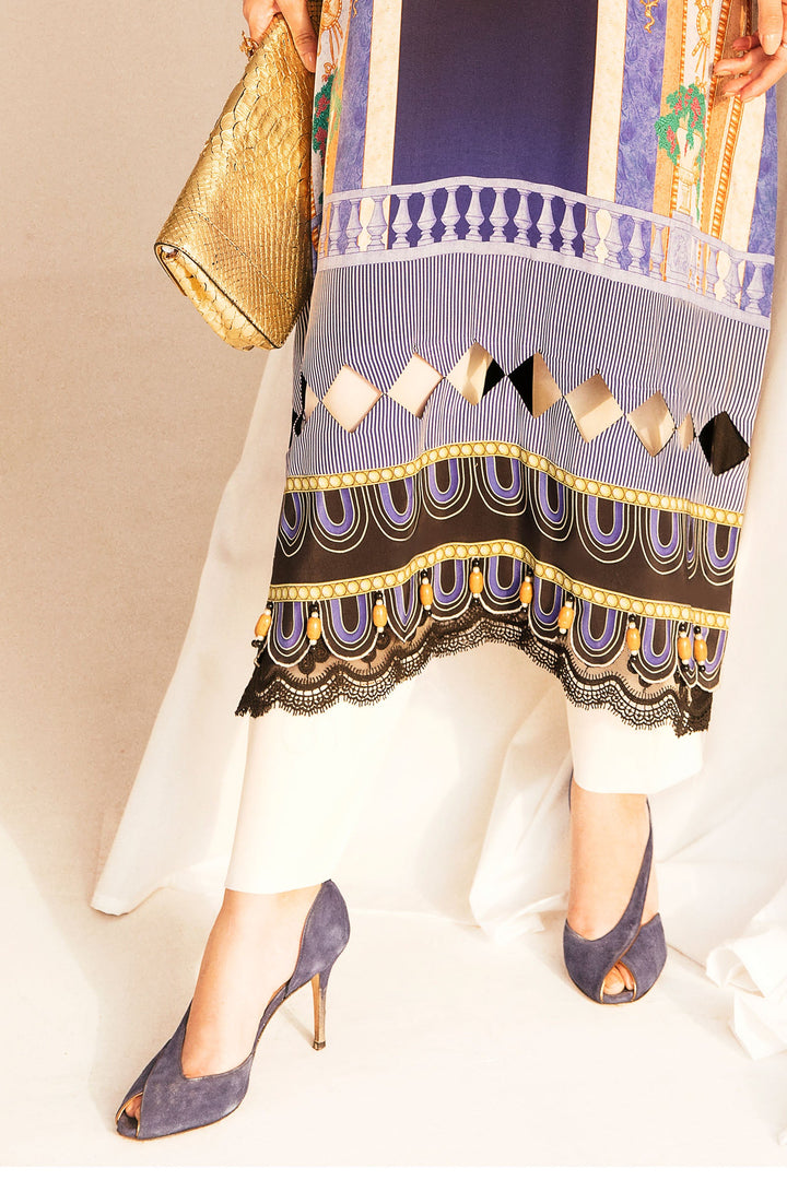 ‘Hana' - an iconic, flowing design that makes an instant statement. This obsidian shirt is crafted from premium silk color blocked with indigo and accents of sandstone and ivory to create an artsy composition. This is a perfectly apt look for a woman who wants to make all heads turn!