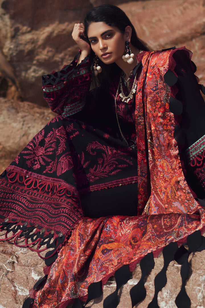 A valiant obsidian hue serves as the canvas for ‘Medea’. A blend of luminous ornamental and floral embroideries are laid out in shades of bright red. Accompanied by an artsy printed pure satin dupatta with vibrant hues of scarlet, tangerine and crimson on an ebony base and paired with a tonal trouser, this regal ensemble is for the quintessential Élan woman who is not afraid to command attention.