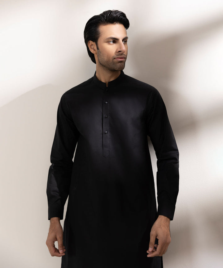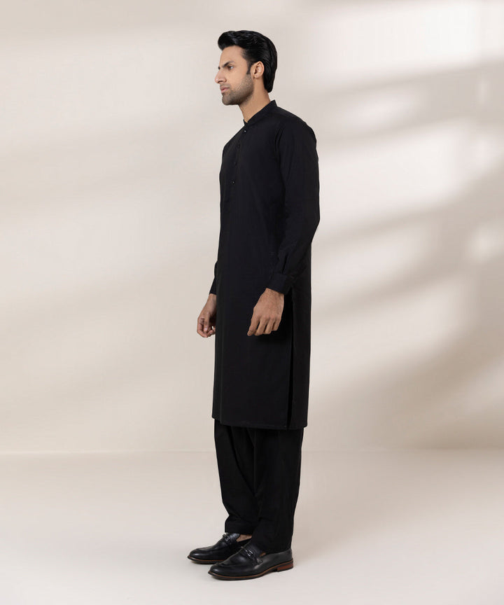 Upgrade your wardrobe with our black fine cotton two-piece suit.