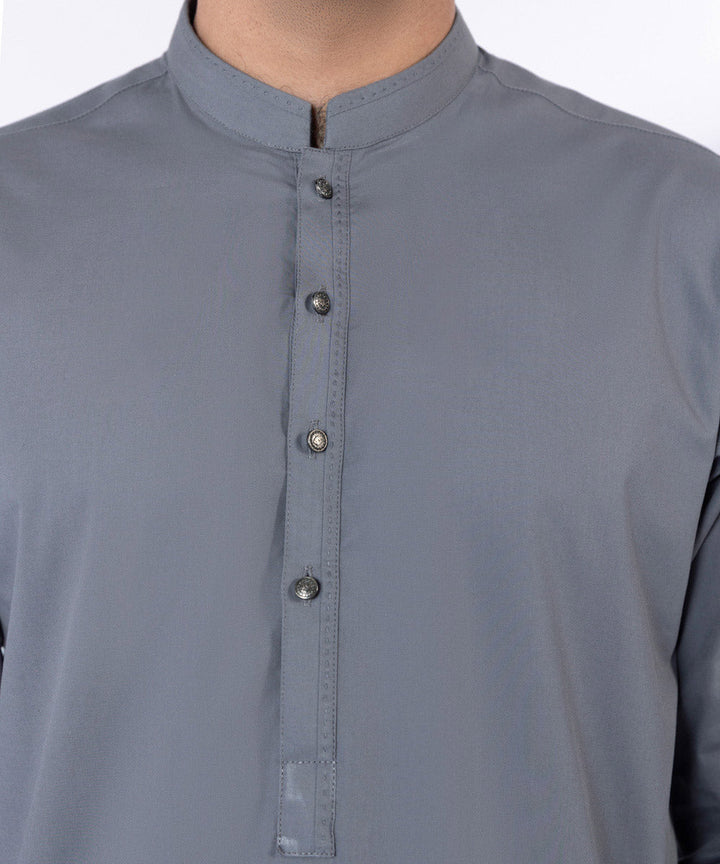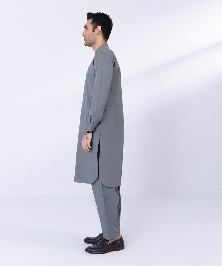 Make a dapper statement in our grey fine cotton two-piece suit featuring straight kurta with detailing & shalwar.