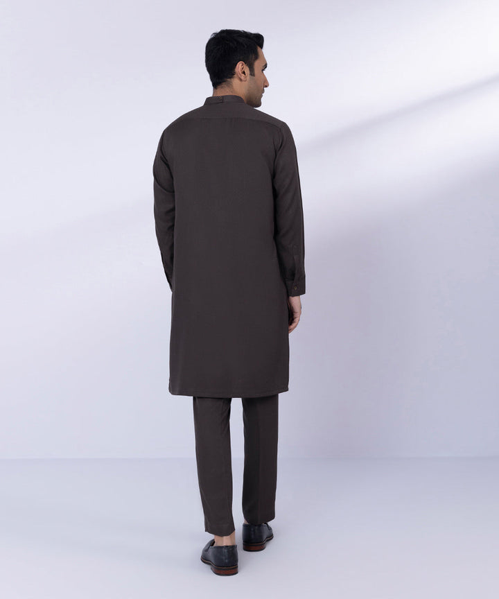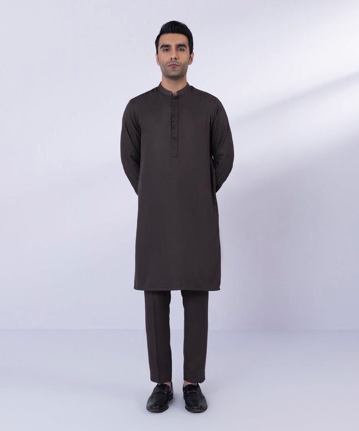 Uplift your style with our dark mauve wash & wear self textured two-piece suit featuring straight kurta with detailing & trouser.