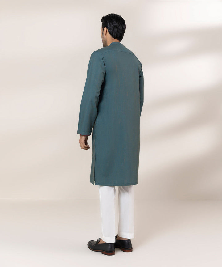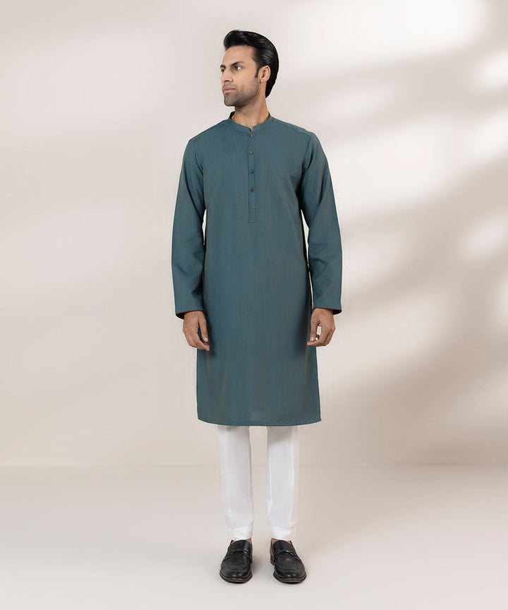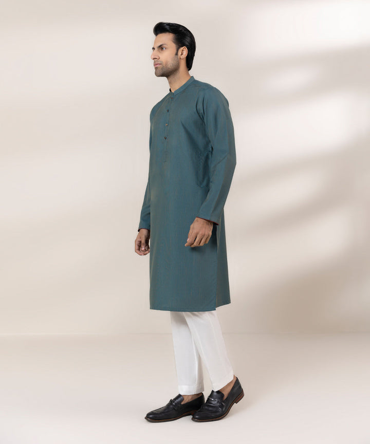 Make a dapper appearance in our teal kurta featuring contrast detailing on sleeves.